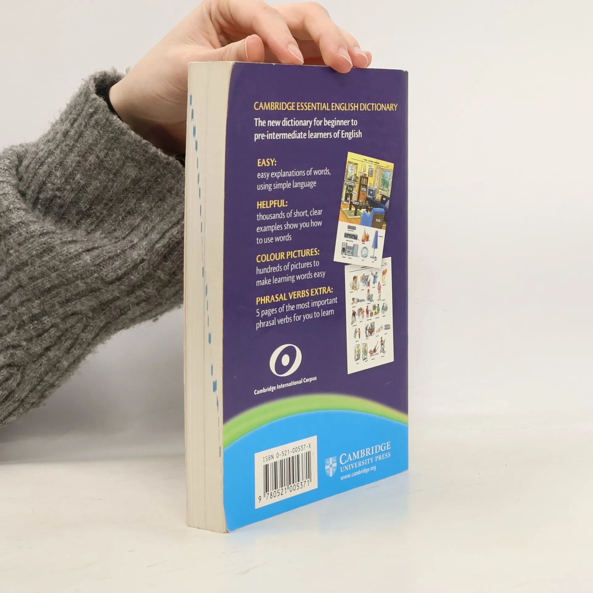 Ideal for KET, PET and Starters, Movers and Flyers Tests preparation Using a learner?s dictionary for the first time can be daunting, but the Cambridge Essential English Dictionary makes that first step easier for learners with short definitions that are easy to understand, and lots of example sentences to put the language into context. There are also hundreds of illustrations for those words that are more simply explained with a picture. The best bits of the dictionary ... *Clear, easy definitions for 12,000 words and phrases help to build students? confidence along with their vocabulary. *Thousands of short, natural example sentences show learners exactly how the language is used. *Unique 'Phrasal Verbs to Learn' section focuses learners' attention on the language that they'll need the most. *Hundreds of illustrations and colour pictures make learning even easier.