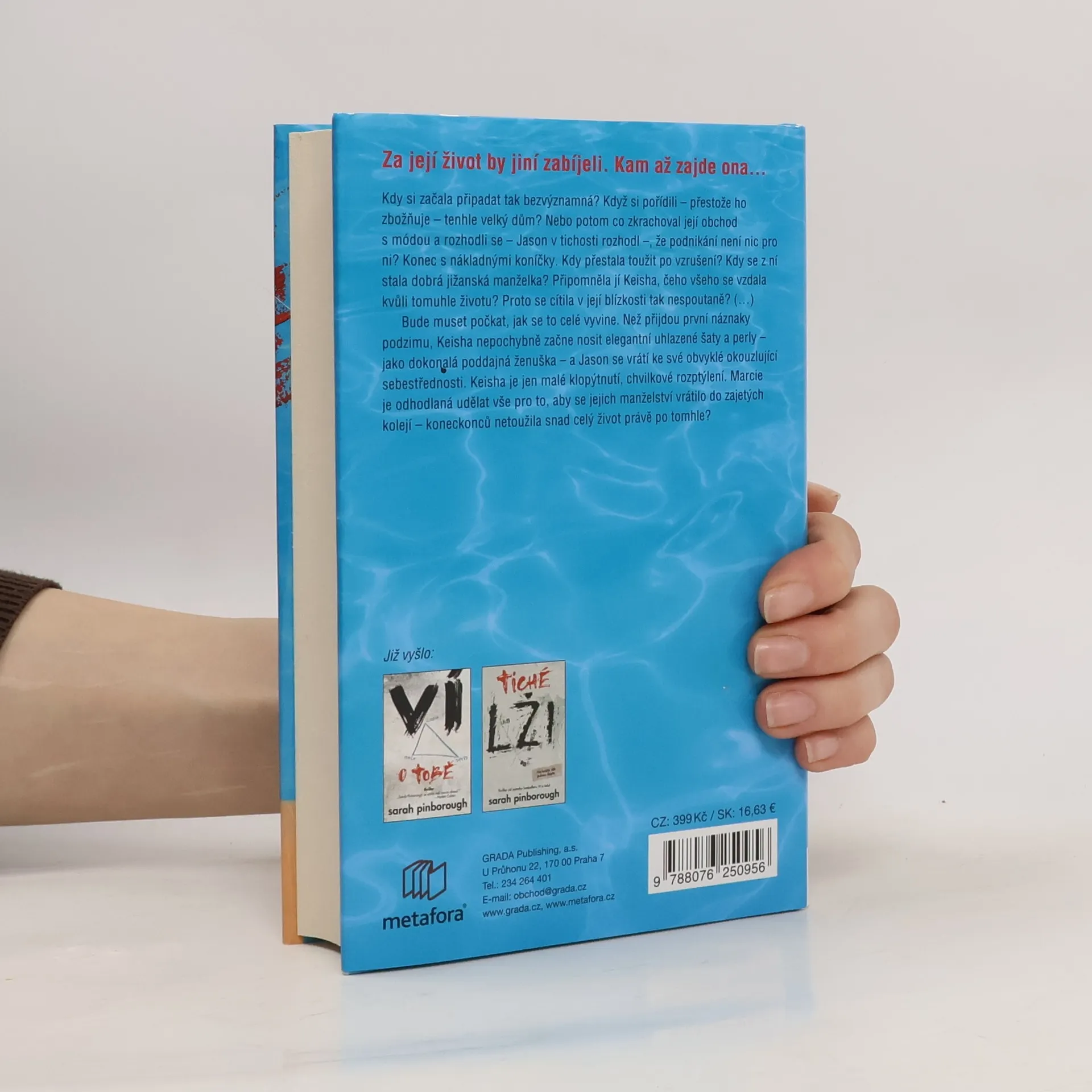 Být ta druhá může být vražedné. Říká se „jednou záletník, vždycky záletník“. Marcie Maddoxová tvrdě pracovala, aby se dostala tam, kde je teď. Po aféře, která proběhla před několika lety, vede úplně jiný život, ale její nový svět – svět venkovských klubů, jacht a okázalých domů v Savannah v Georgii – není jednoduché udržovat bez ohledu na to, jak moc se snaží. Stejně tak jako není snadné udržet si manžela Jasona, který jí k tomu všemu otevřel dveře. Když se Jasonův šéf vrátí z návštěvy Londýna s novou manželkou, mladá paní Radfordová není vyloženě suvenýr, který si ostatní představovali. Keisha je sexy, neskutečně nádherná a černoška… a rychle převezme Marciino místo krásné druhé manželky. A ve chvíli, kdy Marcie zahlédne nezaměnitelné jiskření mezi Keishou a Jasonem, je načase začít jednat. Pomsta se prý nejlépe podává zastudena, ale během rozpáleného léta se v Savannah krev vaří tak, že by snadno mohla někoho smrtelně spálit. Thriller o prohnané druhé manželce, která pro své postavení udělá takřka cokoliv. Pro čtenáře Sedmilhářek od Lianne Moriarty a fanoušky Lisy Jewell. Sarah Pinborough ve své novince opět dokazuje, že je mistryní svého řemesla, tak hlavně #neprozraďteKonec.