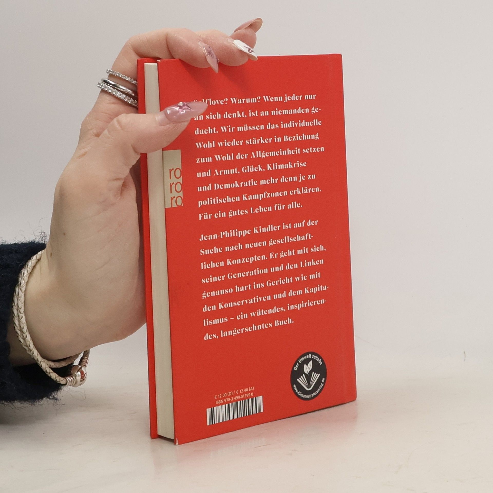 Selflove? Warum? Wenn jeder nur an sich denkt, ist an niemanden gedacht. Wir müssen das individuelle Wohl wieder stärker in Beziehung zum Wohl der Allgemeinheit setzen und Armut, Glück, Klimakrise und Demokratie mehr denn je zu politischen Kampfzonen erklären. Für ein gutes Leben für alle. Jean-Philippe Kindler ist auf der Suche nach neuen gesellschaftlichen Konzepten. Er geht mit sich, seiner Generation und den Linken genauso hart ins Gericht wie mit den Konservativen und dem Kapitalismus – ein wütendes, inspirierendes, langersehntes Buch. «Auf den ersten Blick scheinen junge Menschen ungemein politisch zu sein. Sie sind sprachsensibel, sie sind rassismuskritisch, sie geben bußfertig Beichte über ihre unverdienten Privilegien ab. Sie sind laut Tinder-Biografie äußerst empathisch und kennen ihren Persönlichkeitstyp, sie ernähren sich vegan und verzichten aufs Fliegen ... Jene Konzepte individueller Glücksmaximierung scheinen aber nur auf den ersten Blick ein kulturelles Gegenprogramm zur neoliberalen Anforderung der Selbstoptimierung zu sein. Denn auch in den unzähligen Aufforderungen sich selbst und den unperfekten Körper zu lieben, seine Mitmenschen korrekt und sprachsensibel anzusprechen, sich nachhaltig und emissionsarm zu verhalten, blitzt die Obsession mit dem eigenen Selbst ganz deutlich auf.» Jean-Philippe Kindler