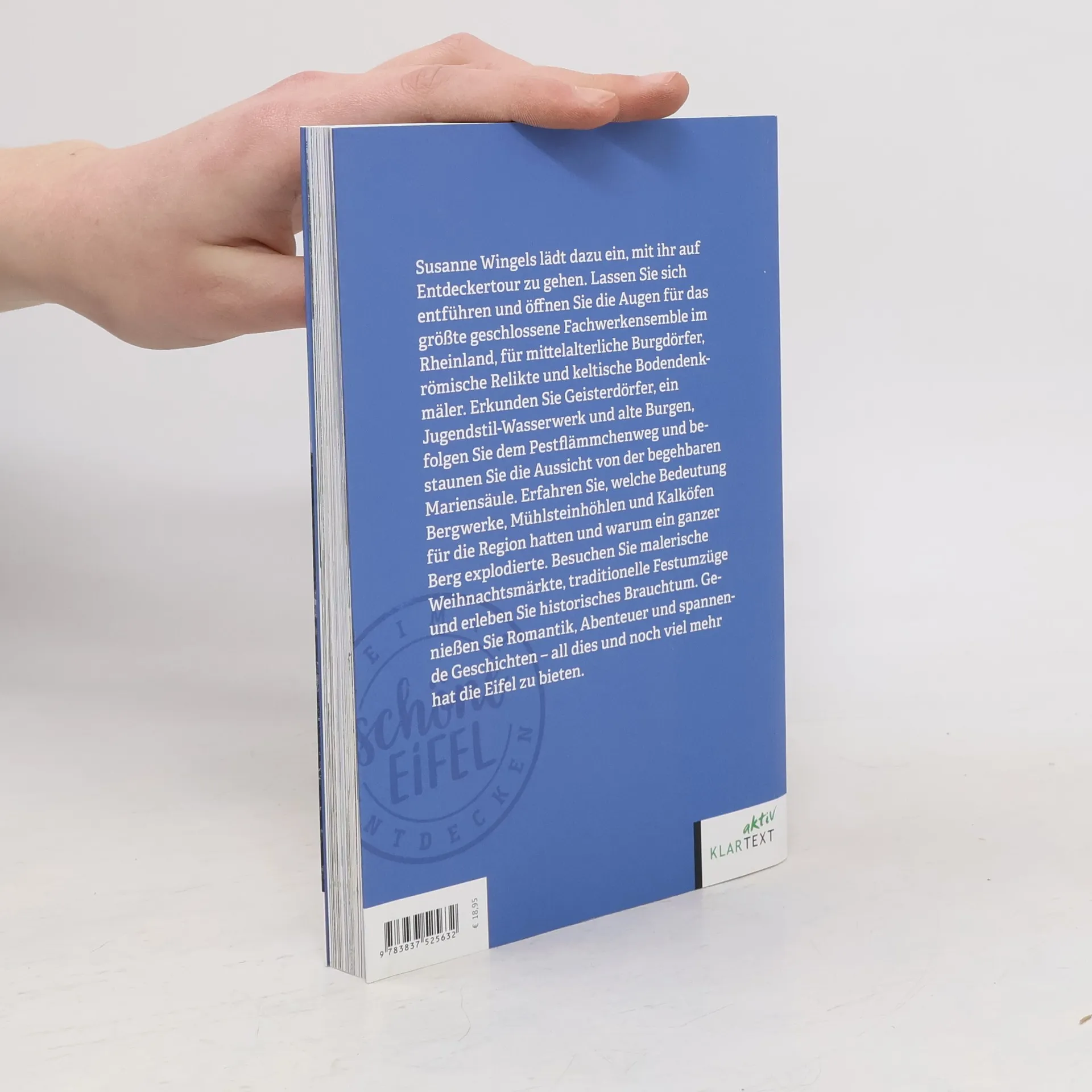 Susanne Wingels lädt dazu ein, mit ihr auf Entdeckertour zu gehen. Lassen Sie sich entführen und öffnen Sie die Augen für das größte geschlossene Fachwerkensemble im Rheinland, für mittelalterliche Burgdörfer, römische Relikte und keltische Bodendenkmäler. Erkunden Sie Geisterdörfer, ein Jugendstil-Wasserwerk und alte Burgen, folgen Sie dem Pestflämmchenweg und bestaunen Sie die Aussicht von der begehbaren Mariensäule. Erfahren. Sie, welche Bedeutung Bergwerke, Mühlsteinhöhlen und Kalköfen für die Region hatten und warum ein ganzer Berg explodierte. Besuchen Sie malerische Weihnachtsmärkte, traditionelle Festumzüge und erleben Sie historisches Brauchtum. Genießen. Sie Romantik, Abenteuer und spannende Geschichten – all dies hat die Eifel zu bieten und noch viel mehr.