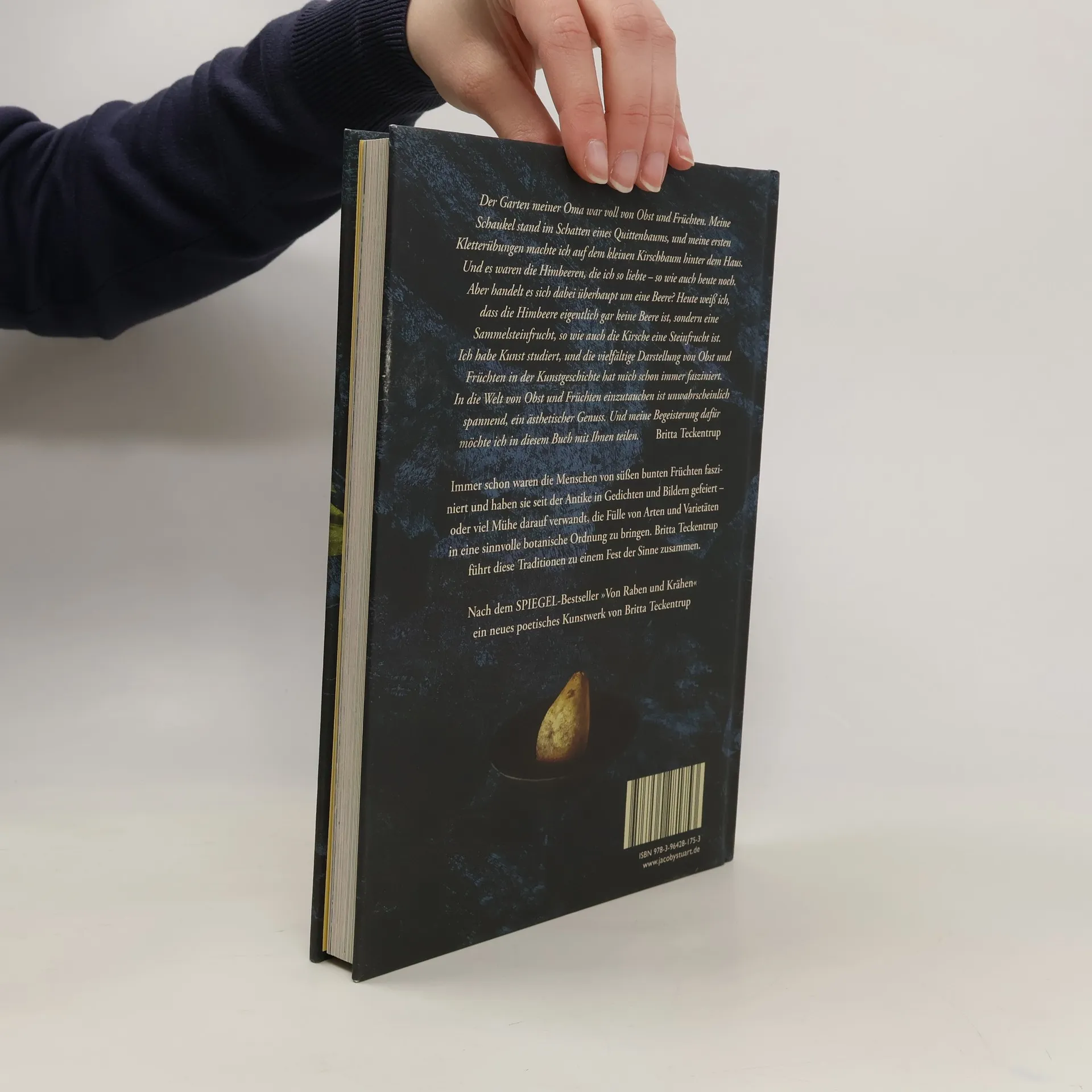 »Der Garten meiner Oma war voll von Obst und Früchten. Meine Schaukel stand im Schatten eines Quittenbaums, meine ersten Kletterübungen machte ich auf dem kleinen Kirschbaum hinter dem Haus. Damals kamen mir die Bäume und der Garten riesig vor. Und es waren die Himbeeren, die ich so liebte – so wie auch heute noch. Aber handelt es sich dabei überhaupt um eine Beere? Heute weiß ich, dass die Himbeere eigentlich gar keine Beere ist, sondern eine Sammelsteinfrucht, so wie auch die Kirsche eine Steinfrucht ist. In die Welt von Obst und Früchten einzutauchen ist unwahrscheinlich spannend, ein ästhetischer Genuss. Und meine Begeisterung dafür möchte ich in diesem Buch mit Ihnen teilen.« Britta Teckentrup