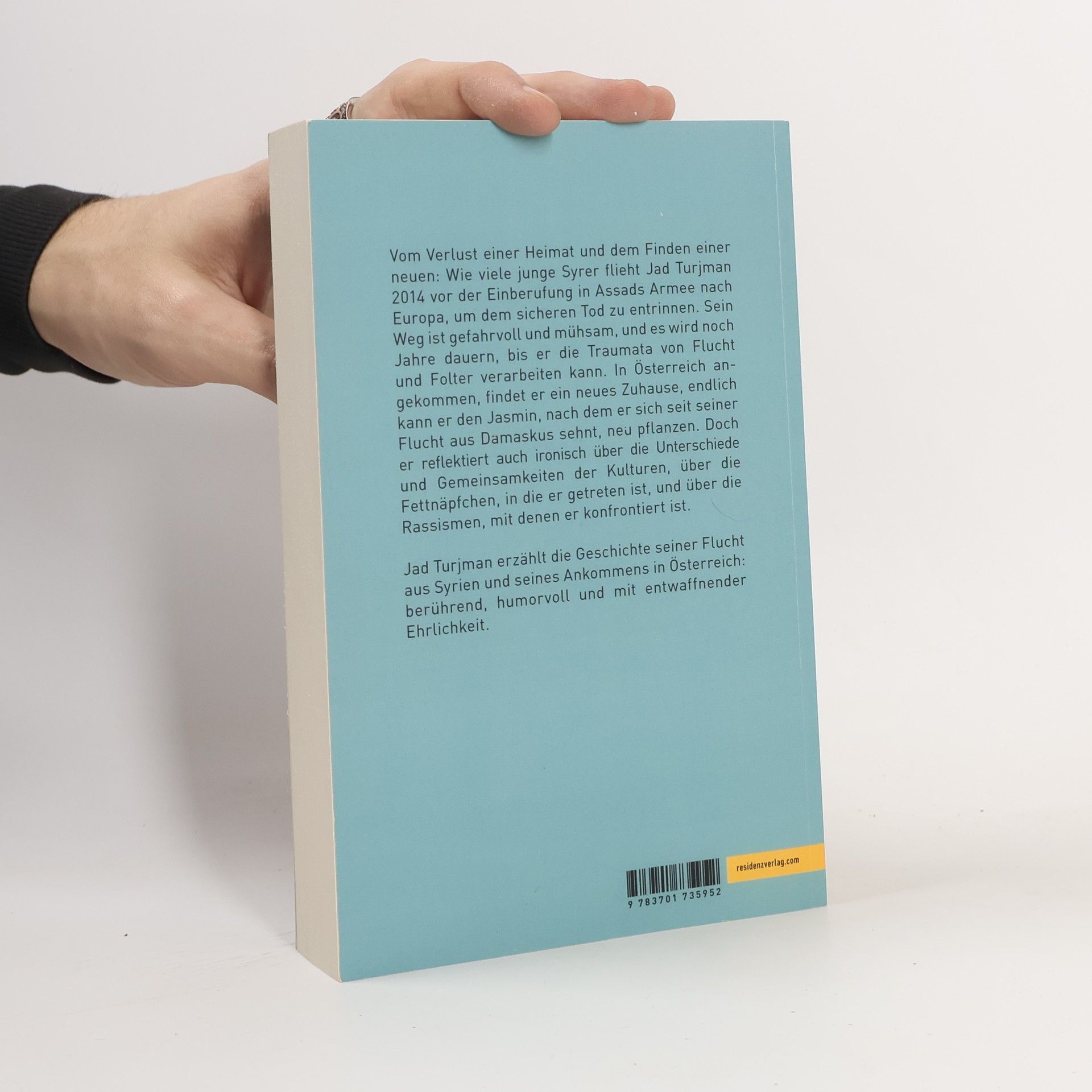 Jad Turjman erzählt die Geschichte seiner Flucht aus Syrien und seines Ankommens in Österreich: berührend, humorvoll und mit entwaffnender Ehrlichkeit Vom Verlust einer Heimat und dem Finden einer neuen: Jad Turjmans Bericht hat Tausende Leser*innen bewegt, nun liegt er erstmals in einem Band vor. Wie viele junge Syrer flieht Jad Turjman 2014 vor der Einberufung in Assads Armee nach Europa, um dem sicheren Tod zu entrinnen. Sein Weg ist gefahrvoll und mühsam, und es wird noch Jahre dauern, bis er die Traumata von Flucht und Folter verarbeiten kann. In Österreich angekommen, findet er ein neues Zuhause, endlich kann er den Jasmin, nach dem er sich seit seiner Flucht aus Damaskus sehnt, neu pflanzen. Doch er reflektiert auch ironisch über die Unterschiede und Gemeinsamkeiten der Kulturen, über die Fettnäpfchen, in die er getreten ist, und über die Rassismen, mit denen er konfrontiert ist.
