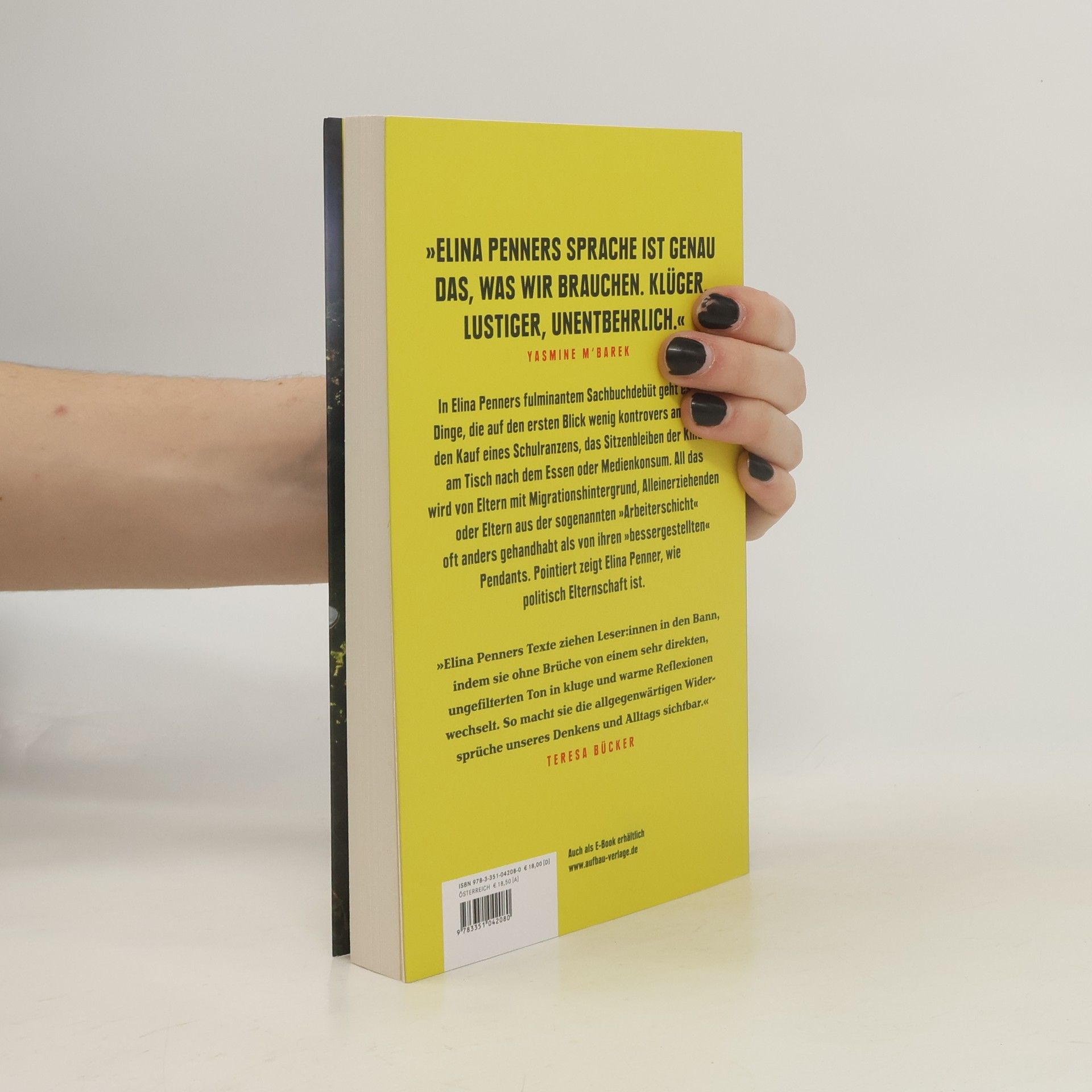 »Elina Penners Sprache ist genau das, was wir brauchen. Klüger, lustiger, unentbehrlich.« Yasmine M‘Barek In Elina Penners fulminantem Sachbuchdebüt geht es um Dinge, die auf den ersten Blick wenig kontrovers anmuten: den Kauf eines Schulranzens, das Sitzenbleiben der Kinder am Tisch nach dem Essen oder Medienkonsum. All das wird von Eltern mit Migrationshintergrund, Alleinerziehenden oder Eltern aus der sogenannten »Arbeiterschicht« oft anders gehandhabt als von ihren »bessergestellten« Pendants. Pointiert zeigt Elina Penner, wie politisch Elternschaft ist. »Elina Penners Texte ziehen Leser: innen in den Bann, indem sie ohne Brüche von einem sehr direkten, ungefilterten Ton in kluge und warme Reflexionen wechselt. So macht sie die allgegenwärtigen Widersprüche unseres Denkens und Alltags sichtbar.« Teresa Bücker