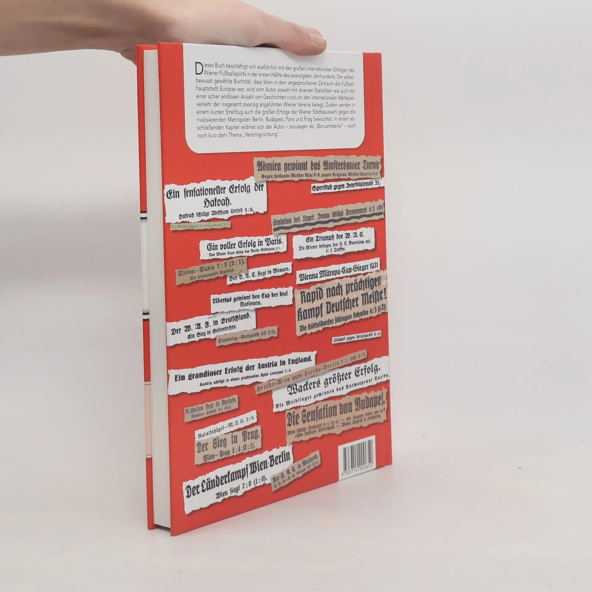 Dieses Buch beschäftigt sich ausführlich mit den großen internationalen Erfolgen des Wiener Fußballsports in der ersten Hälfte des zwanzigsten Jahrhunderts. Der selbstbewusst gewählte Buchtitel, dass Wien in dem angesprochenen Zeitraum die Fußballhauptstadt Europas war, wird vom Autor sowohl mit diversen Statistiken wie auch mit einer schier endlosen Anzahl von Geschichten rund um den internationalen Wettspielverkehr der insgesamt zwanzig angeführten Wiener Vereine belegt. Zudem werden in einem kurzen Streifzug auch die großen Erfolge der Wiener Städteauswahl gegen die rivalisierenden Metropolen Berlin, Budapest, Paris und Prag beleuchtet. In einem abschließenden Kapitel widmet sich der Autor – sozusagen als „Bonusmaterial“ – auch noch kurz dem Thema „Vereinsgründung“.