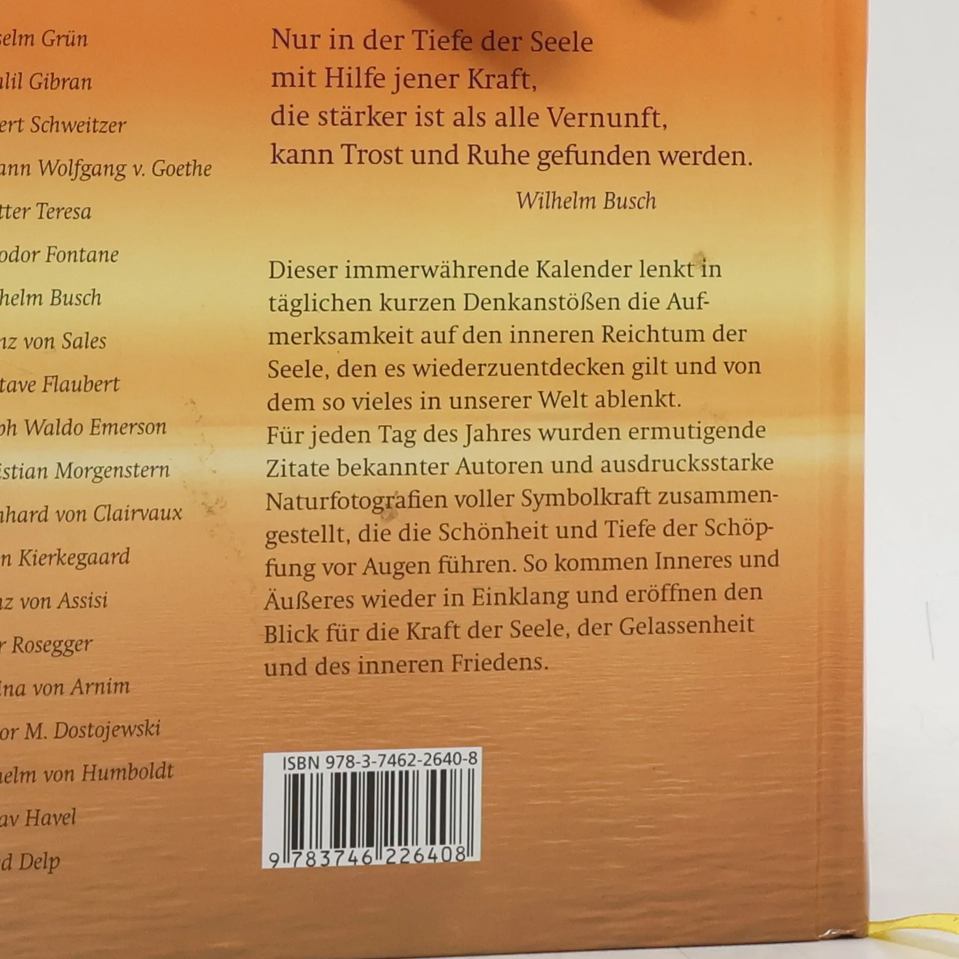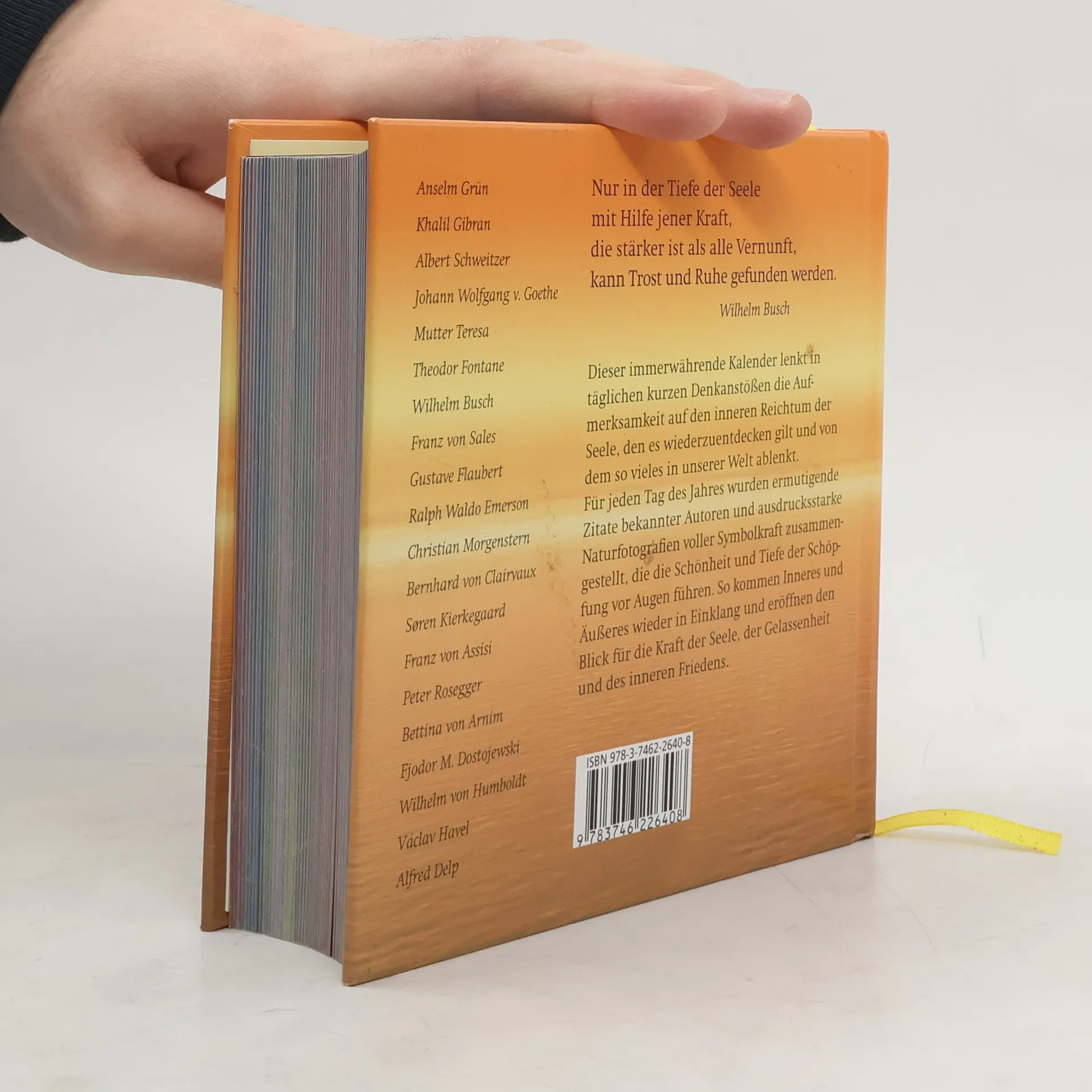 Mehrfach war dieses Buch in den christlichen Bestsellerlisten, nun ist es als besonders preiswerte Sonderausgabe erhältlich. Jeder Monat dieses immerwährenden Kalenders ist einem Thema wie Glaube, Liebe, Hoffnung oder Gelassenheit gewidmet, das Glücksimpulse enthält und die Seele aufatmen lässt. Prägnante Zitate beliebter Autoren wie Khalil Gibran, Mutter Theresa, John Henry Newman oder Wilhelm Raabe und aus der Bibel werden von wunderschönen Naturfotografien untermalt.