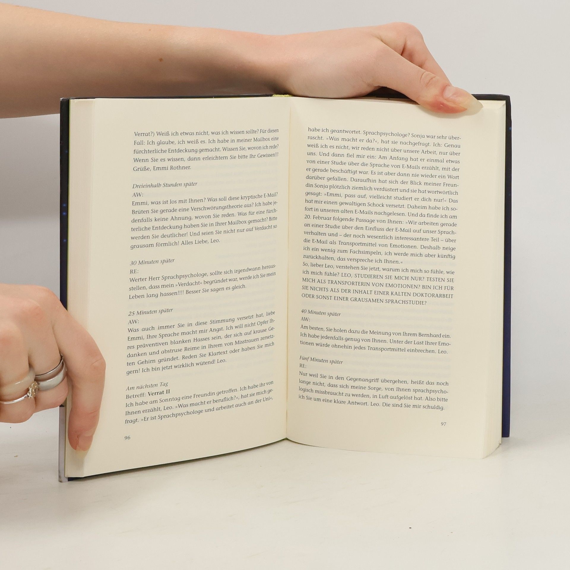 Gibt es in einer vom Alltag besetzten Wirklichkeit einen besser geschützten Raum für gelebte Sehnsüchte als den virtuellen? Bei Leo Leike landen irrtümlich E-Mails einer ihm unbekannten Emmi Rothner. Aus Höflichkeit antwortet er ihr. Und weil sich Emmi von ihm angezogen fühlt, schreibt sie zurück. Bald scheint es nur noch eine Frage der Zeit zu sein, wann es zum ersten persönlichen Treffen kommt, aber diese Frage wühlt beide so sehr auf, dass sie die Antwort lieber noch eine Weile hinauszögern. Außerdem ist Emmi glücklich verheiratet. Und Leo verdaut gerade eine gescheiterte Beziehung. Und überhaupt: Werden die gesendeten, empfangenen und gespeicherten Liebesgefühle einer Begegnung standhalten? Und was, wenn ja?