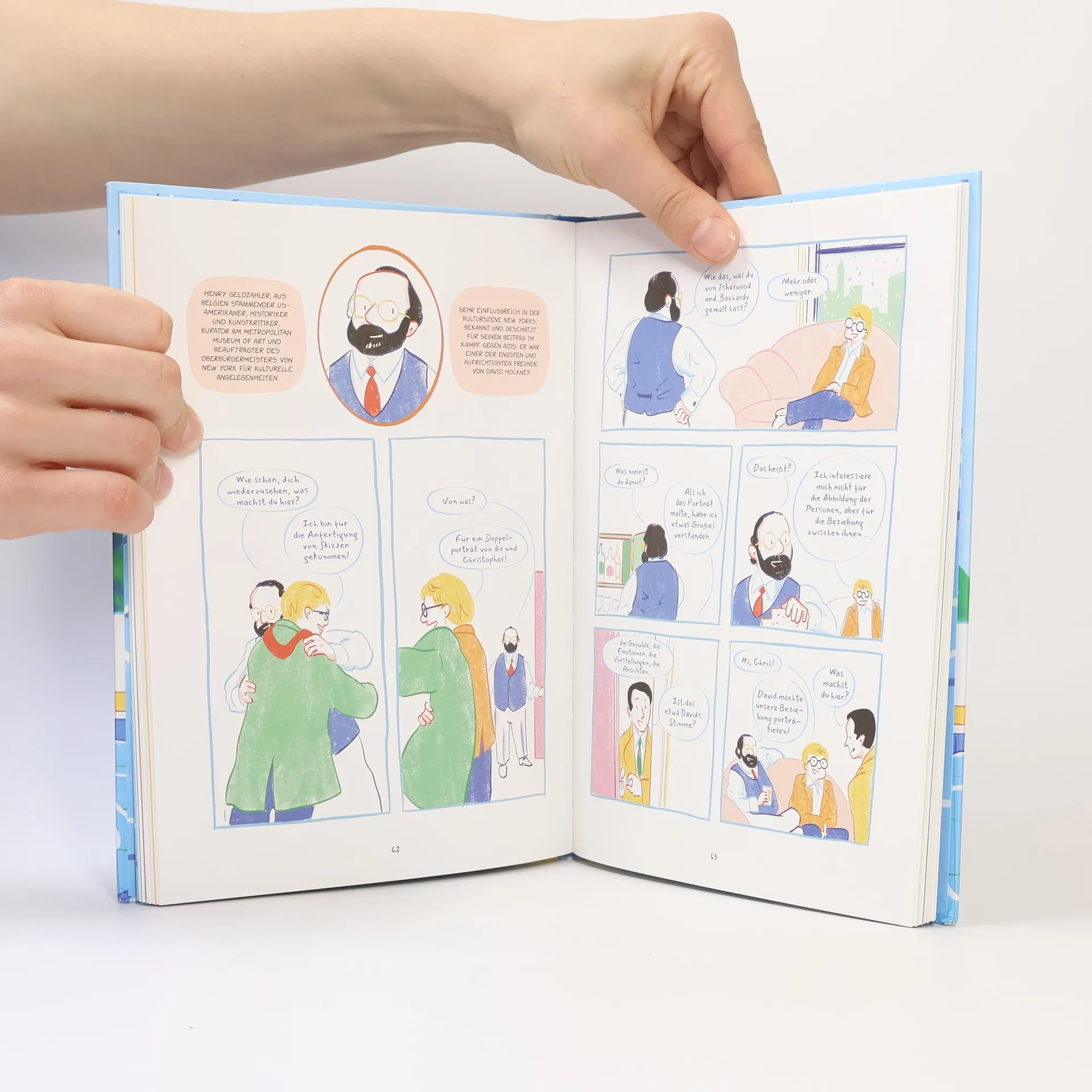 Die biografische Graphic Novel zu einem der bekanntesten und erfolgreichsten Maler der Gegenwart David Hockneys Arbeit ist stark von seinem persönlichen Leben beeinflusst. Von diesem reichen und spannenden Leben wollte der Künstler aus seiner eigenen Perspektive, mit seinen eigenen Emotionen und mit seinen Bildern erzählen. David Hockneys Leben und Werk werden in dieser Graphic Novel von einem imaginären Museumswärter in der Tate Britain in London in den Tagen vor der Eröffnung seiner großen Retrospektive erzählt. Eine farbenfroh illustrierte Graphic Novel, die auch für Kunsteinsteiger geeignet ist.