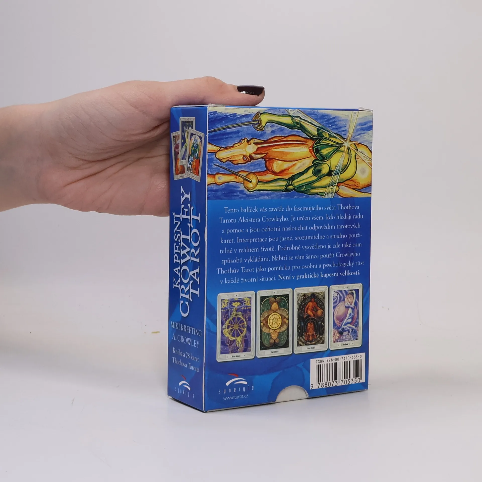Tento balíček vás zavede do fascinujícího světa Thothova Tarotu Aleistera Crowleyho. Je určen všem, kdo hledají radu a pomoc a jsou ochotni naslouchat odpovědím tarotových karet. Interpretace jsou jasné, srozumitelné a snadno použitelné v reálném životě. Podrobně vysvětleno je zde také osm způsobů vykládání. Nabízí se vám šance použít Crowleyho Thothův Tarot jako pomůcku pro osobní a psychologický růst v každé životní situaci. Nyní v praktické kapesní velikosti.