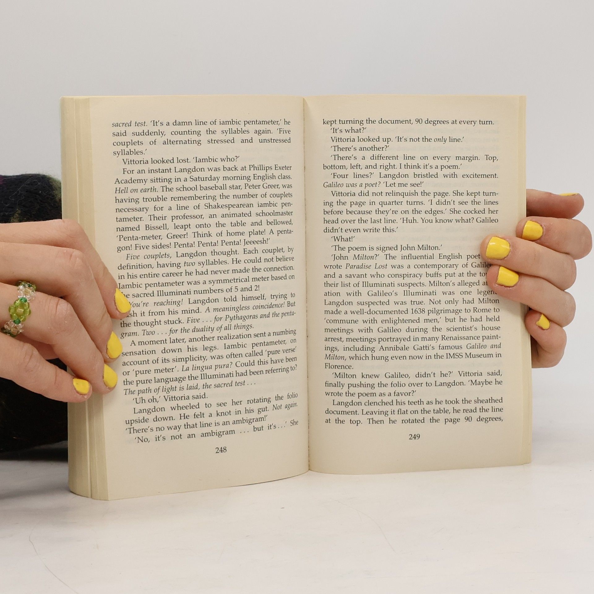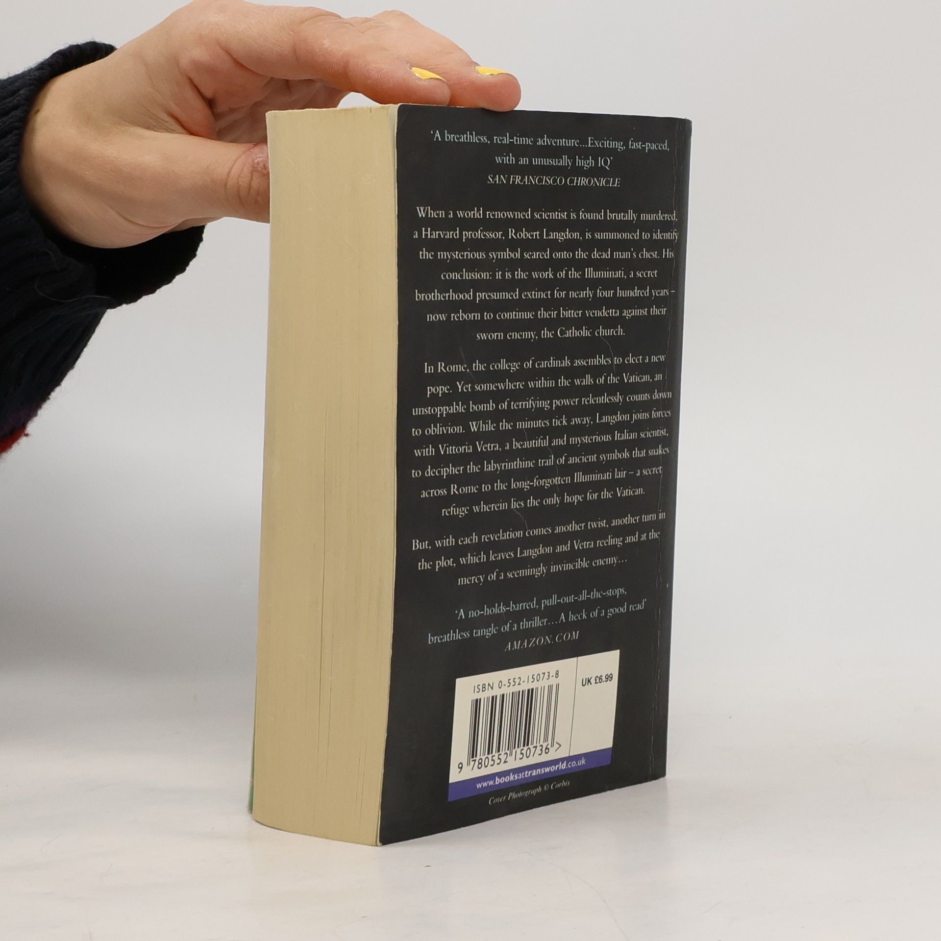 When a world renowned scientist is found brutally murdered in a Swiss research facility, a Harvard professor, Robert Langdon, is summoned to identify the mysterious symbol seared onto the dead man's chest. His baffling conclusion: it is the work of the Illuminati, a secret brotherhood presumed extinct for nearly four hundred years - reborn to continue their bitter vendetta against their sworn enemy, the Catholic church. In Rome, the college of cardinals assembles to elect a new pope. Yet somewhere within the walls of the Vatican, an unstoppable bomb of terrifying power relentlessly counts down to oblivion. While the minutes tick away, Langdon joins forces with Vittoria Vetra, a beautiful and mysterious Italian scientist, to decipher the labyrinthine trail of ancient symbols that snakes across Rome to the long-forgotten Illuminati lair - a secret refuge wherein lies the only hope for the Vatican. But with each revelation comes another twist, another turn in the plot, which leaves Langdon and Vetra reeling and at the mercy of a seemingly invisible enemy... --back cover