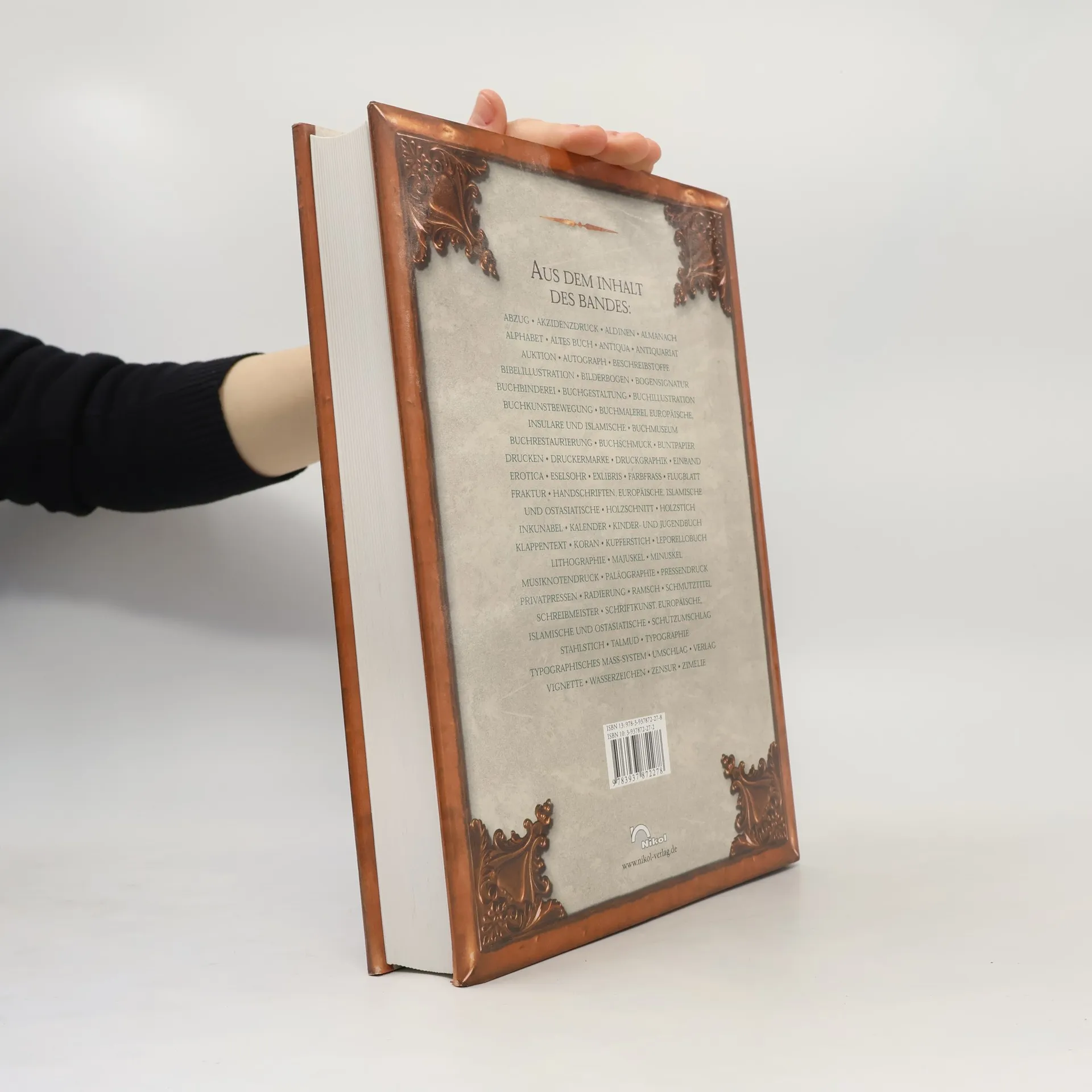 Aus dem Inhalt: Abzug • Akzidenzdruck • Aldinen • Almanach • Alphabet • altes Buch • Antiqua • Antiquariat • Auktion • Autograph • Beschreibstoffe • Bibelillustration • Bilderbogen • Bogensignatur • Buchbinderei • Buchgestaltung • Buchillustration • Buchkunstbewegung • Buchmalerei, europäische, insulare und islamische • Buchmuseum • Buchrestaurierung • Buchschmuck • Buntpapier • Drucken • Druckermarke • Druckgraphik • Einband • Erotica • Eselohr • Exlibris • Farbfrass • Flugblatt • Fraktur • Handschriften, europäische, islamische und ostasiatische • Holzschnitt • Holzstich • Inkunabel • Kalender • Kinder- und Jugendbuch • Klappentext • Koran • Kupferstich • Leporellobuch • Lithographie • Majuskel • Minuskel • Musiknotendruck • Paläographie • Pressendruck • Privatpressen • Radierung • Ramsch • Schmutztitel • Schreibmeister • Schriftkunst, europäische, islamische und ostasiatische • Schutzumschlag • Stahlstich • Talmud • Typographie • typographisches Mass-System • Umschlag • Verlag • Vignette • Wasserzeichen • Zensur • Zimelie