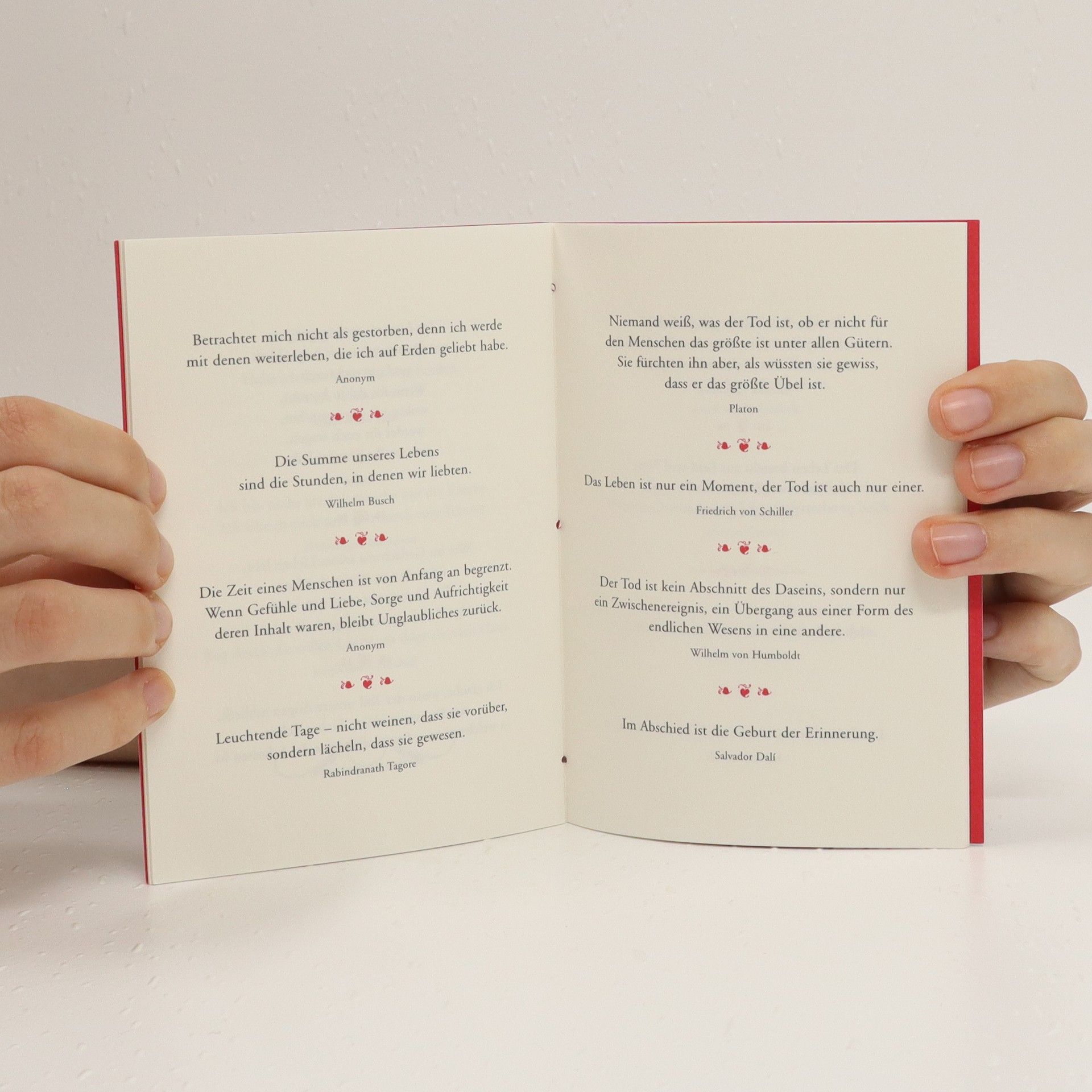 Edles Papier, ein gepflegtes Design, der echte rote Faden und nicht zuletzt der unschlagbar niedrige Preis sind das Markenzeichen dieser ausgefallenen Geschenkbuchreihe. Wie schon die erfolgreichen Vorgänger überzeugen die sechs neuen Bände der Reihe „Der rote Faden“ durch ihre geistreichen Zitate, Aphorismen und Gedichte. Die handgebundenen Bücher sind stilvolle Geschenke zu vielen Anlässen: als liebe Geste in Zeiten der Trauer, als Geschenk zum Geburtstag, als kleines Dankeschön oder als Mitbringsel zum Essen oder einfach so.