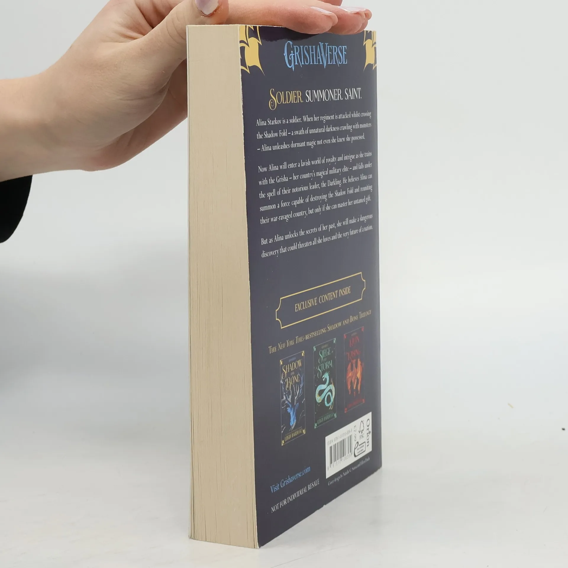 Surrounded by enemies, the once-great nation of Ravka has been torn in two by the Shadow Fold, a swath of near impenetrable darkness crawling with monsters who feast on human flesh. Now its fate may rest on the shoulders of one lonely refugee. Alina Starkov has never been good at anything. But when her regiment is attacked on the Fold and her best friend is brutally injured, Alina reveals a dormant power that saves his life—a power that could be the key to setting her war-ravaged country free. Wrenched from everything she knows, Alina is whisked away to the royal court to be trained as a member of the Grisha, the magical elite led by the mysterious Darkling. Yet nothing in this lavish world is what it seems. With darkness looming and an entire kingdom depending on her untamed power, Alina will have to confront the secrets of the Grisha . . . and the secrets of her heart. Shadow and Bone is the first installment in Leigh Bardugo's Grisha Trilogy.