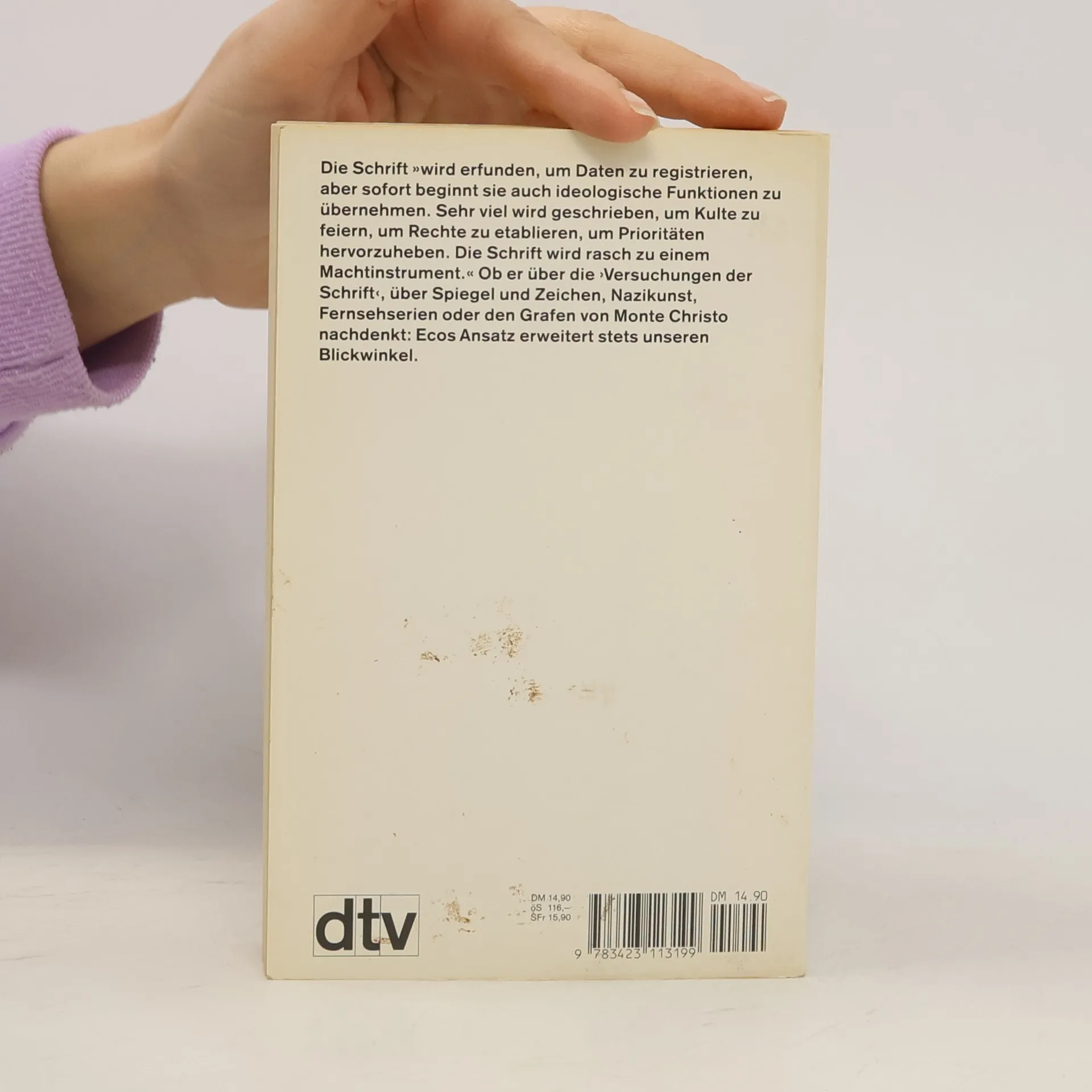Narziß beugt sich übers Wasser. Auf der blanken Oberfläche erscheint sein Bild. Er lehnt sich zurück, das Bild verschwindet, nichts zeugt vom Geschehenen. Das Spiegelbild: kein Zeichen, behauptet Eco. Dem Semiotiker zerfällt die Welt in Zeichen, und wo er keine entdeckt, muß er die Diskrepanz zumindest erklären. Die Lektüre dieses zentralen Essays lohnt nicht nur für Narziß ...Eco versammelt in diesem Band von »Gelegenheitsschriften« Aufsätze zur Ästhetik, Analysen diverser Phänomene der populären Kultur, kritische Textinterpretationen, philosophische und semiotische Schriften.Das Themenspektrum reicht von den Formen der Darstellung, experimenteller und avantgardistischer Kunst, Massenmedien und Literatur bis zu möglichen Welten der Science-fiction, detektivischer Phantasie und Täuschung. Ecos semiotischer Ansatz, mit dem er so souverän hantiert wie ein Kartograph mit dem Zirkel, erweist sich dabei immer wieder als überraschend.