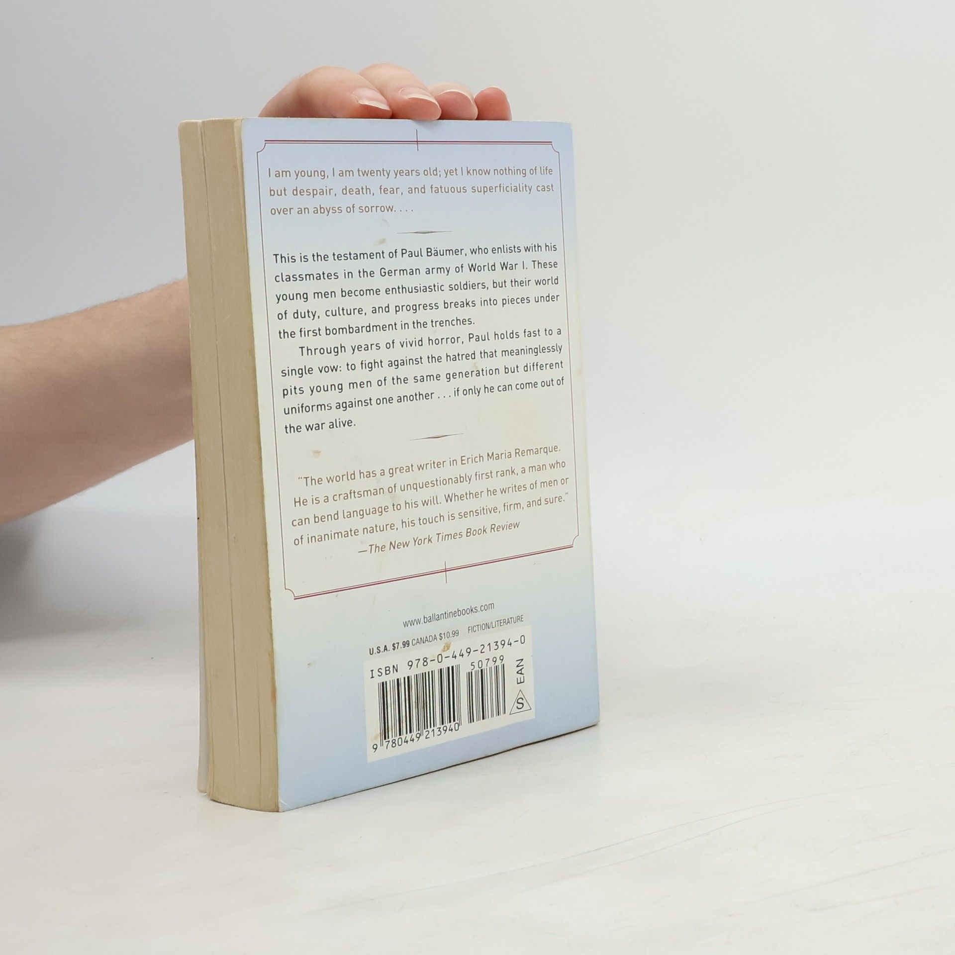The masterpiece of the German experience during World War I, considered by many the greatest war novel of all time—with an Oscar–winning film adaptation now streaming on Netflix. “[Erich Maria Remarque] is a craftsman of unquestionably first rank.”—The New York Times Book Review I am young, I am twenty years old; yet I know nothing of life but despair, death, fear, and fatuous superficiality cast over an abyss of sorrow. . . . This is the testament of Paul Bäumer, who enlists with his classmates in the German army during World War I. They become soldiers with youthful enthusiasm. But the world of duty, culture, and progress they had been taught breaks in pieces under the first bombardment in the trenches. Through years of vivid horror, Paul holds fast to a single vow: to fight against the principle of hate that meaninglessly pits young men of the same generation but different uniforms against one another . . . if only he can come out of the war alive.