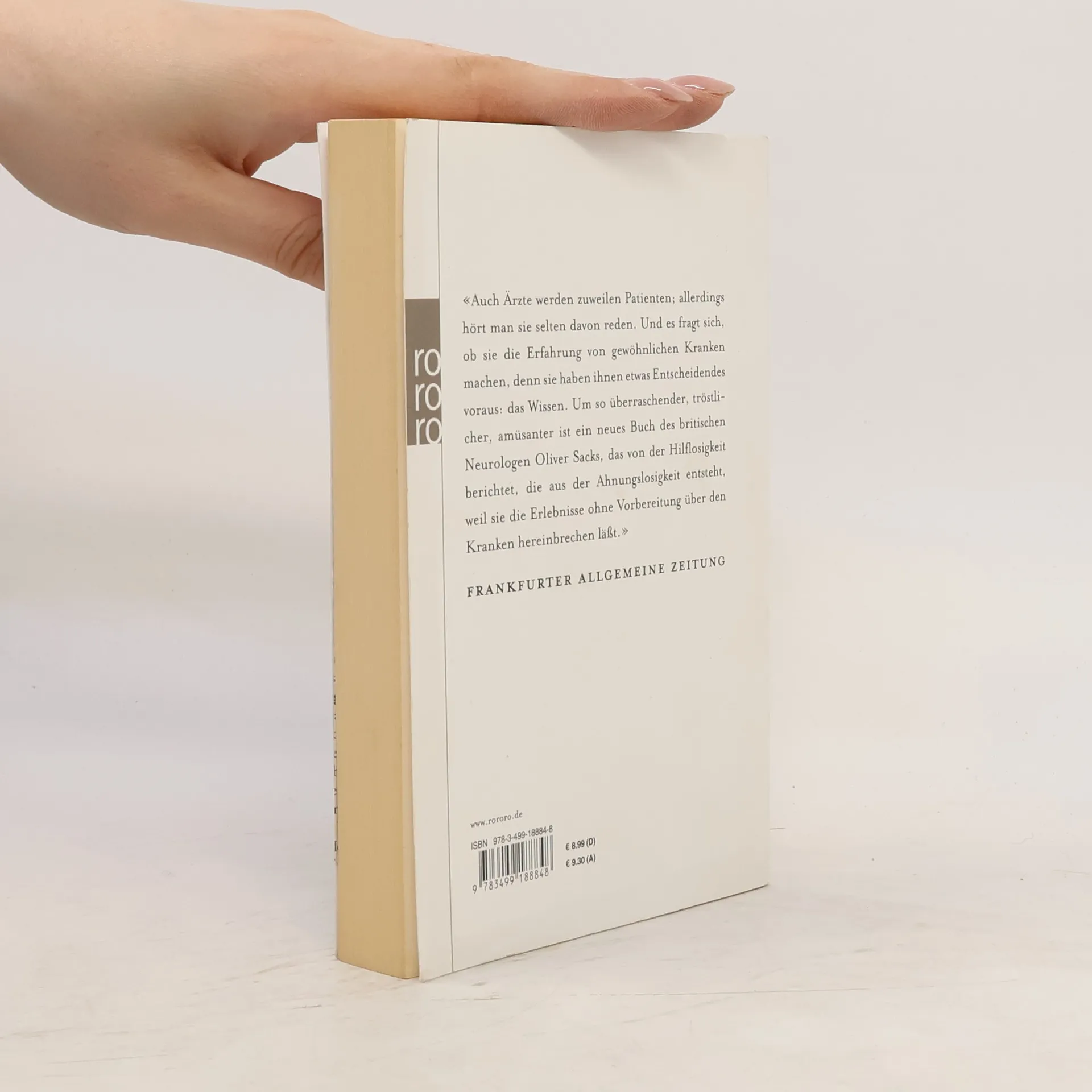 «Auch Ärzte werden zuweilen Patienten; allerdings hört man sie selten davon reden. Und es fragt sich, ob sie die Erfahrung von gewöhnlichen Kranken machen, denn sie haben ihnen etwas Entscheidendes voraus: das Wissen. Um so überraschender, tröstlicher, amüsanter ist ein neues Buch des britischen Neurologen Oliver Sacks, das von der Hilflosigkeit berichtet, die aus der Ahnungslosigkeit entsteht, weil sie die Erlebnisse ohne Vorbereitung über den Kranken hereinbrechen läßt.» Frankfurter Allgemeine Zeitung