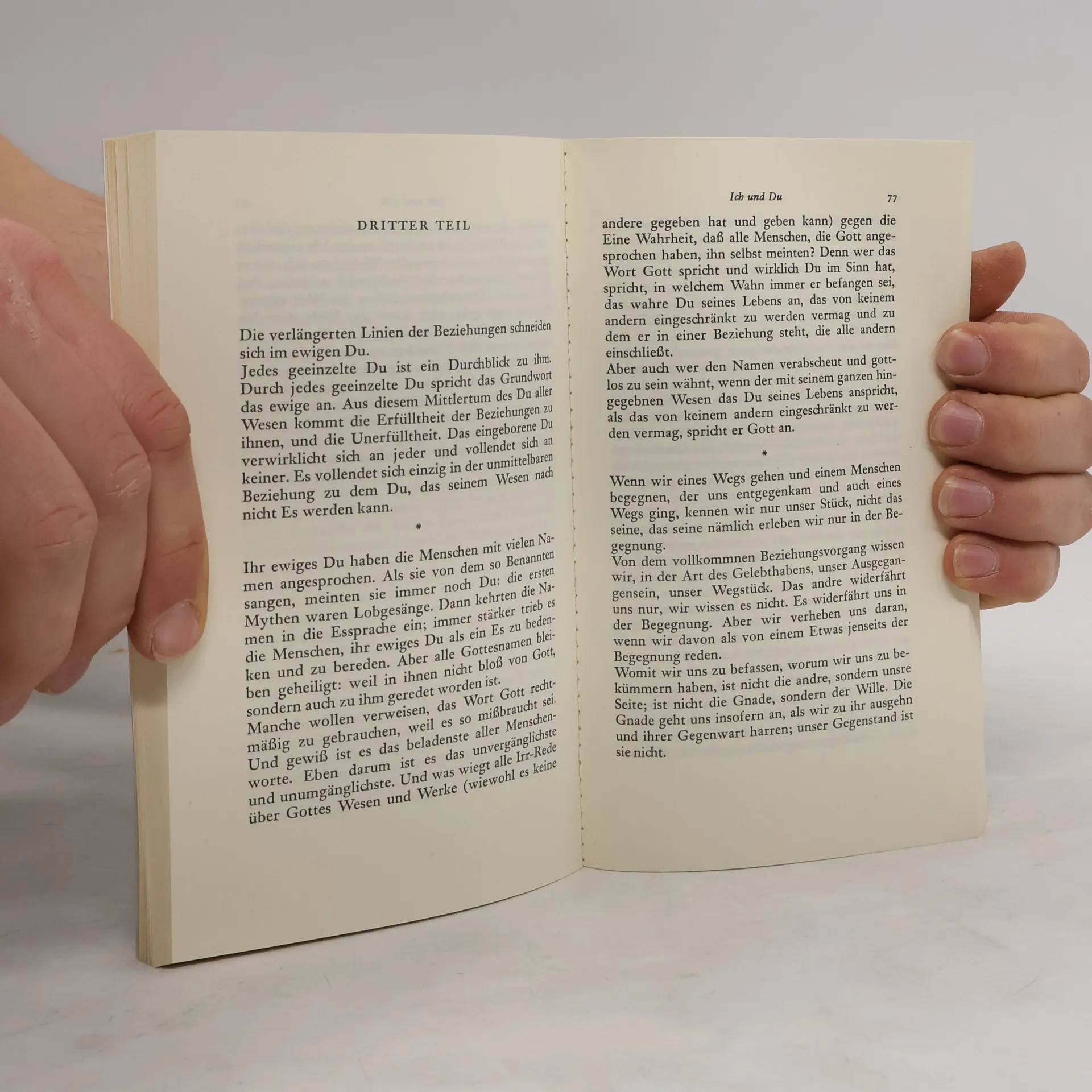 In Bubers Grundtexten zum dialogischen Denken geht es um die Begegnung, den Dialog zwischen dem Ich und dem anderen, zwischen dem Menschen und dem "ewigen Du", Gott.