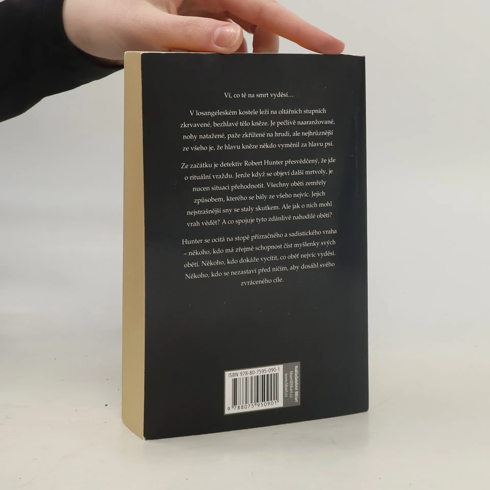 Ví, co tě na smrt vyděsí… V losangeleském kostele leží na oltářních stupních zkrvavené, bezhlavé tělo kněze. Je pečlivě naaranžované, nohy natažené, paže křížené na hrudi, ale nejhrůznější ze všeho je, že hlavu kněze někdo vyměnil za hlavu psí. Ze začátku je detektiv Robert Hunter přesvědčený, že jde o rituální vraždu. Jenže když se objeví další mrtvoly, je nucen situaci přehodnotit. Všechny oběti zemřely způsobem, kterého se bály ze všeho nejvíc. Jejich nejstrašnější sny se staly skutkem. Ale jak o nich mohl vrah vědět? A co spojuje tyto zdánlivě nahodilé oběti? Hunter se ocitá na stopě přízračného a sadistického vraha – někoho, kdo má zřejmě schopnost číst myšlenky svých obětí. Někoho, kdo dokáže vycítit, co oběť nejvíc vyděsí. Někoho, kdo se nezastaví před ničím, aby dosáhl svého zvráceného cíle.
