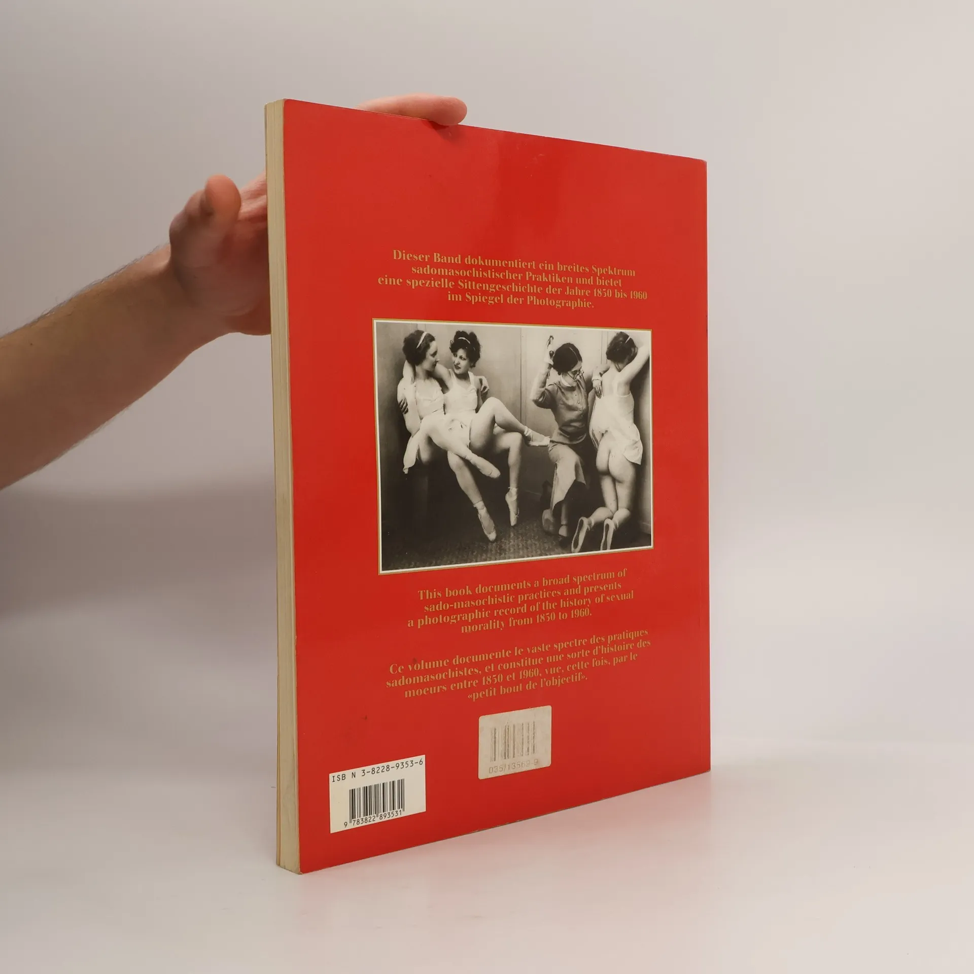 Dieser Band dokumentieerl ein breiles Spektrum sadomasochistischer Prakliken und bietel eine spezielle Sitlengeschichle der Jahre 1850 bis 1960 im Speigel der Photographie. This book documents a broad spectrum of sado-masochistic practices and presents a photographic record of the history of sexual morality from 1850 to 1960. Ce volume documente le vaste spectre des practiques sadomasochistes, et constitue une sorte d'histoire des moeurs entre 1850 et 1960, vue, cette fois, par le "petit bout de l'objectif".