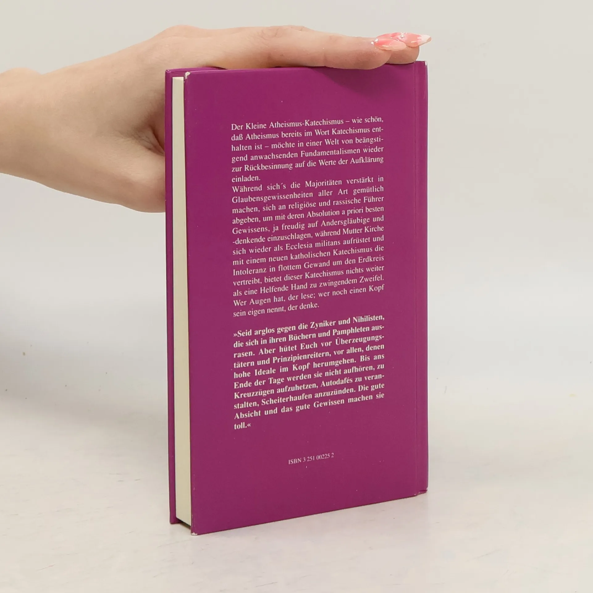 Der Mensch ist nicht einsam. Aber Denken macht einsam. Die Mehrheiten wollen es sich in Glaubensgewissheiten gemütlich machen, ihr Leben unter ewiger Vormundschaft verbringen, sich bei Unbehagen an religiös-politische Führer abgeben, um mit deren Absolution besten Gewissens, ja freudig auf Andersgläubige und -denkende einzuschlagen. In einer Welt des beängstigend anwachsenden Fundamentalismus möchte dieser kleine Katechismus wieder zur Rückbesinnung auf die Werte der Aufklärung einladen. Sie waren den Denkverboten von Kirche und Obrigkeitsstaat mühsam genug abgetrotzt. Wir verdanken ihnen die Freiheit des Denkens, des Redens und des Forschens, die offene Diskussion, die Religionsfreiheit (auch die Freiheit von Religion), die Kunstfreiheit, die Freiheit der Partnerwahl, der sexuellen Ausrichtung, die Freiheit für alle, solange keiner die Freiheit des anderen einschränkt. Wir verdanken ihr Toleranz, Rechtstaatlichkeit, Gewaltenteilung, Emanzipation und zumindest die Vorstellung eines allgemeinen Weltbürgertums. Mit Erstveröffentlichungen von Fritz Senn, Ludger Lütkehaus und Ulrich Holbein. Und Texten von Polly Toynbee, Georg Büchner, Ludwig Feuerbach, Karl Marx, Arthur Schopenhauer, Charles Darwin, Heinrich Heine, George Henry Borrow, Fritz Mauthner, Sigmund Freud, Theodor Lessing, Oswald Spengler, Friedrich dem Großen, Philip K. Dick, Arno Schmidt und Kinky Friedman.