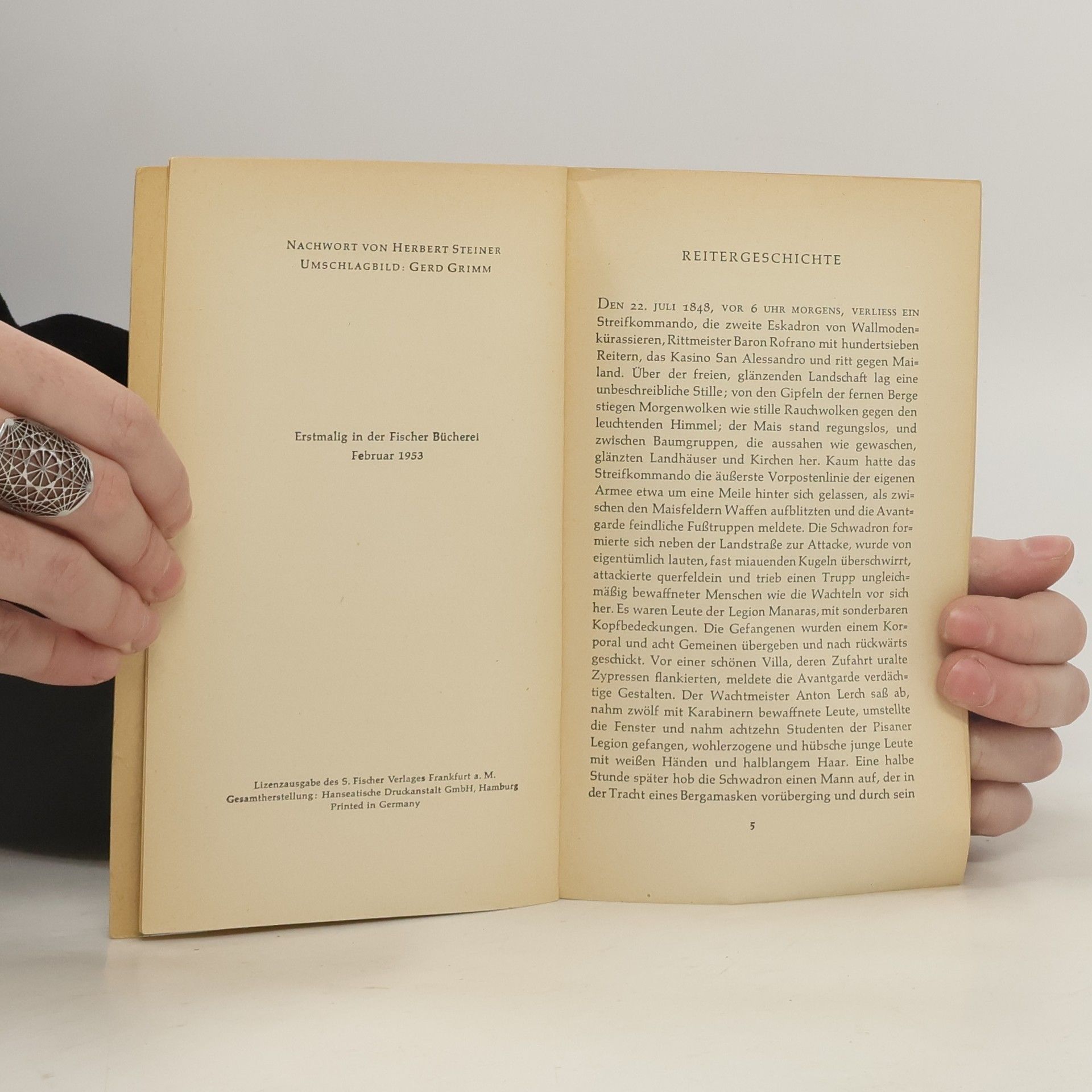 Den 22. Juli 1848, vor 6 Uhr morgens, verließ ein Streifkommando, die zweite Eskadron von Wallmodenkürassieren, Rittmeister Baron Rofrano mit einhundertsieben Reitern, das Kasino San Alessandro und ritt gegen Mailand. Über der freien, glänzenden Landschaft lag eine unbeschreibliche Stille; von den Gipfeln der fernen Berge stiegen Morgenwolken wie stille Rauchwolken gegen den leuchtenden Himmel; der Mais stand regungslos, und zwischen Baumgruppen, die aussahen wie gewaschen, glänzten Landhäuser und Kirchen her. Kaum hatte das Streifkommando die äußerste Vorpostenlinie der eigenen Armee etwa um eine Meile hinter sich gelassen, als zwischen den Maisfeldern Waffen aufblitzten und die Avantgarde feindliche Fußtruppen meldete. Die Schwadron formierte sich neben der Landstraße zur Attacke, wurde von eigentümlich lauten, fast miauenden Kugeln überschwirrt, attackierte querfeldein und trieb einen Trupp ungleichmäßig bewaffneter Menschen wie die Wachteln vor sich her. Es waren Leute der Legion Manaras, mit sonderbaren Kopfbedeckungen.