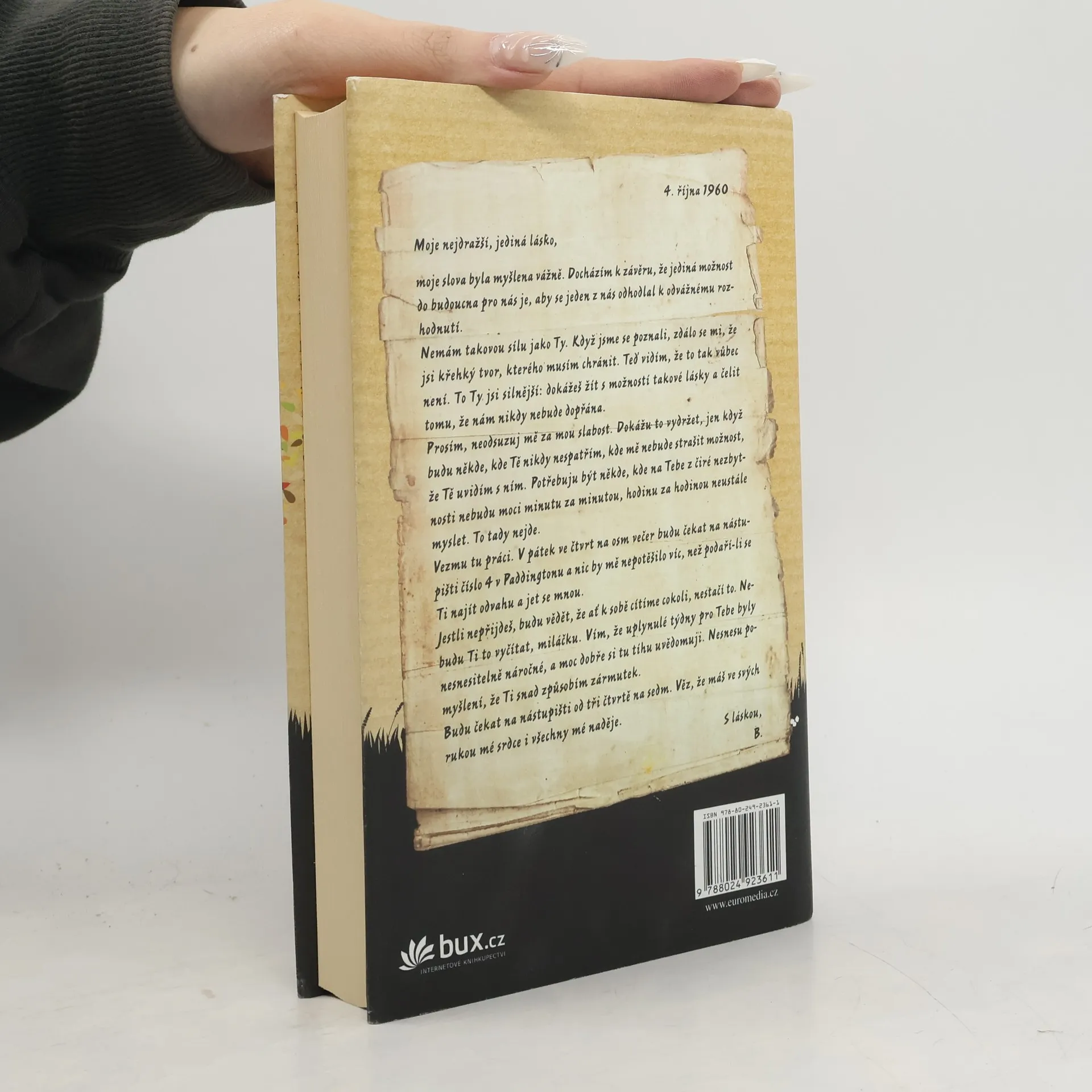 Mimořádně silný příběh vášně, nevěry a ztráty z pera respektované britské autorky Jojo Moyesové, který získal v roce 2011 prestižní ocenění The Romantic Novel of the Year Award. Novinářka Elllie při pátrání v archivu narazí na půlstoletí starý dopis, v němž neznámý muž žádá svoji milenku, aby opustila manžela. Elllie příběh, skrývající se za dopisem, okamžitě zaujme – i ona sama má poměr se ženatým mužem. Rok 1960. Jennifer Stirlingová leží v nemocnici po vážné autonehodě a na nic si nepamatuje – na manžela, na své kamarády, ani na to, jaká byla ona sama. Když se však vrátí z nemocnice domů a najde tajný dopis, pomalu se začíná rozpomínat na milence, kvůli kterému byla kdysi ochotná riskovat úplně všechno.