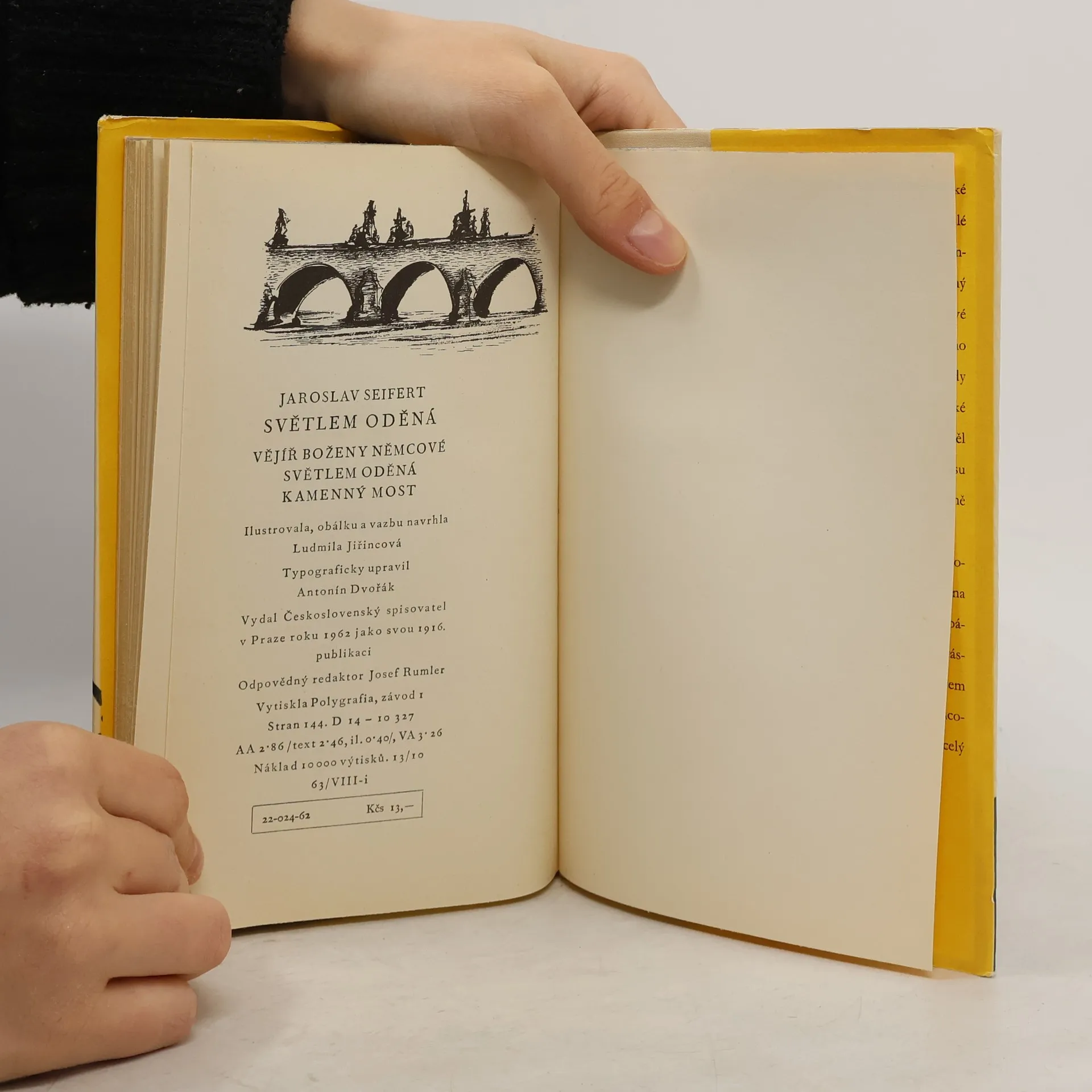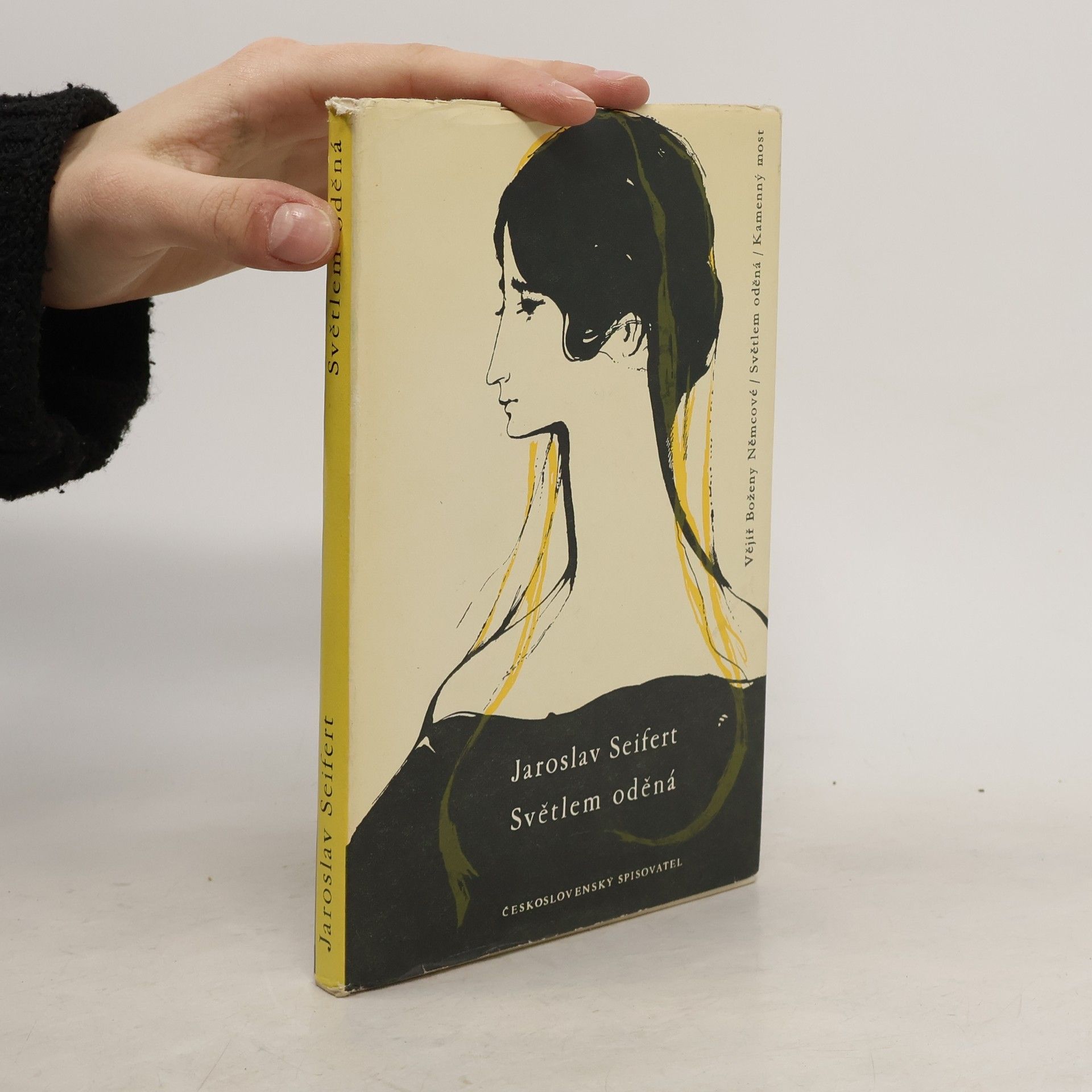 Obsahuje: Vějíř Boženy Němcové, Světlem oděná, Kamenný most. Tři básnické sbírky, vzniklé v těžkých dobách okupace, v nichž básník vyzpíval svou lásku k vlasti a rodnému městu Praze (Světlem oděná, Kamenný most) a vyjádřil své okouzlení zjevem velké spisovatelky (Vějíř Boženy Němcové). První společné vydání.