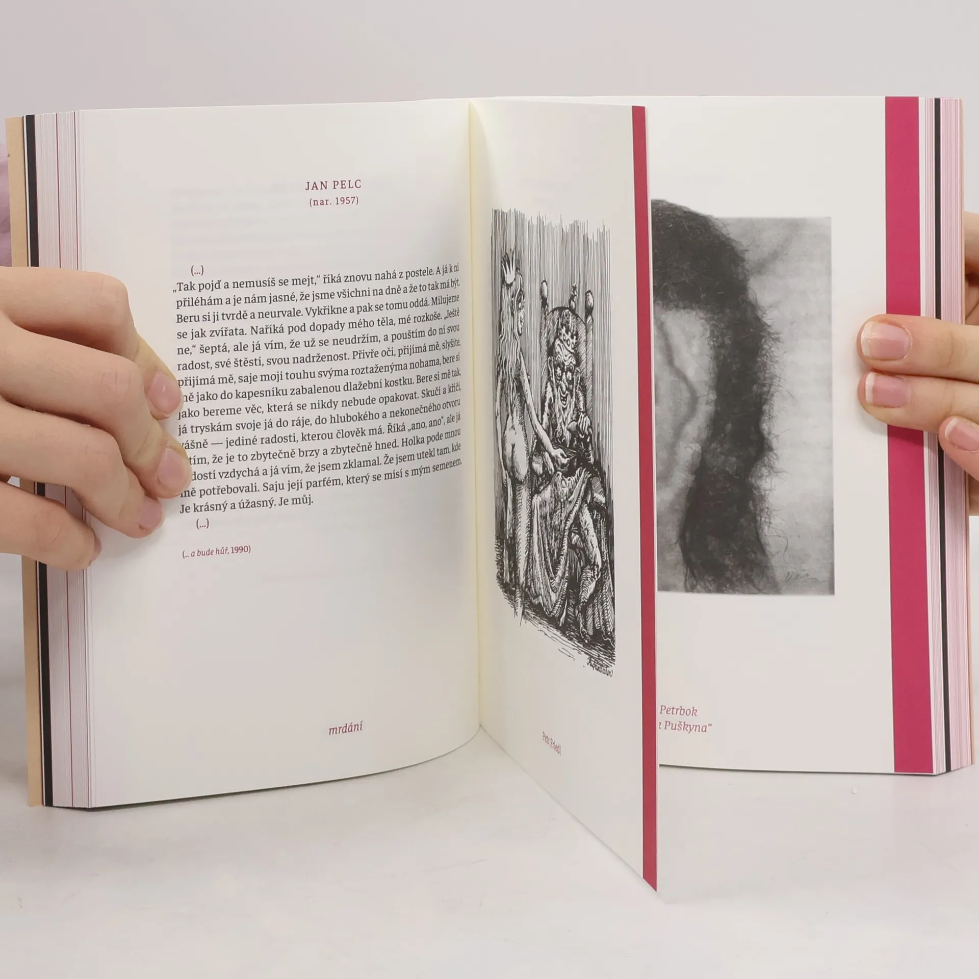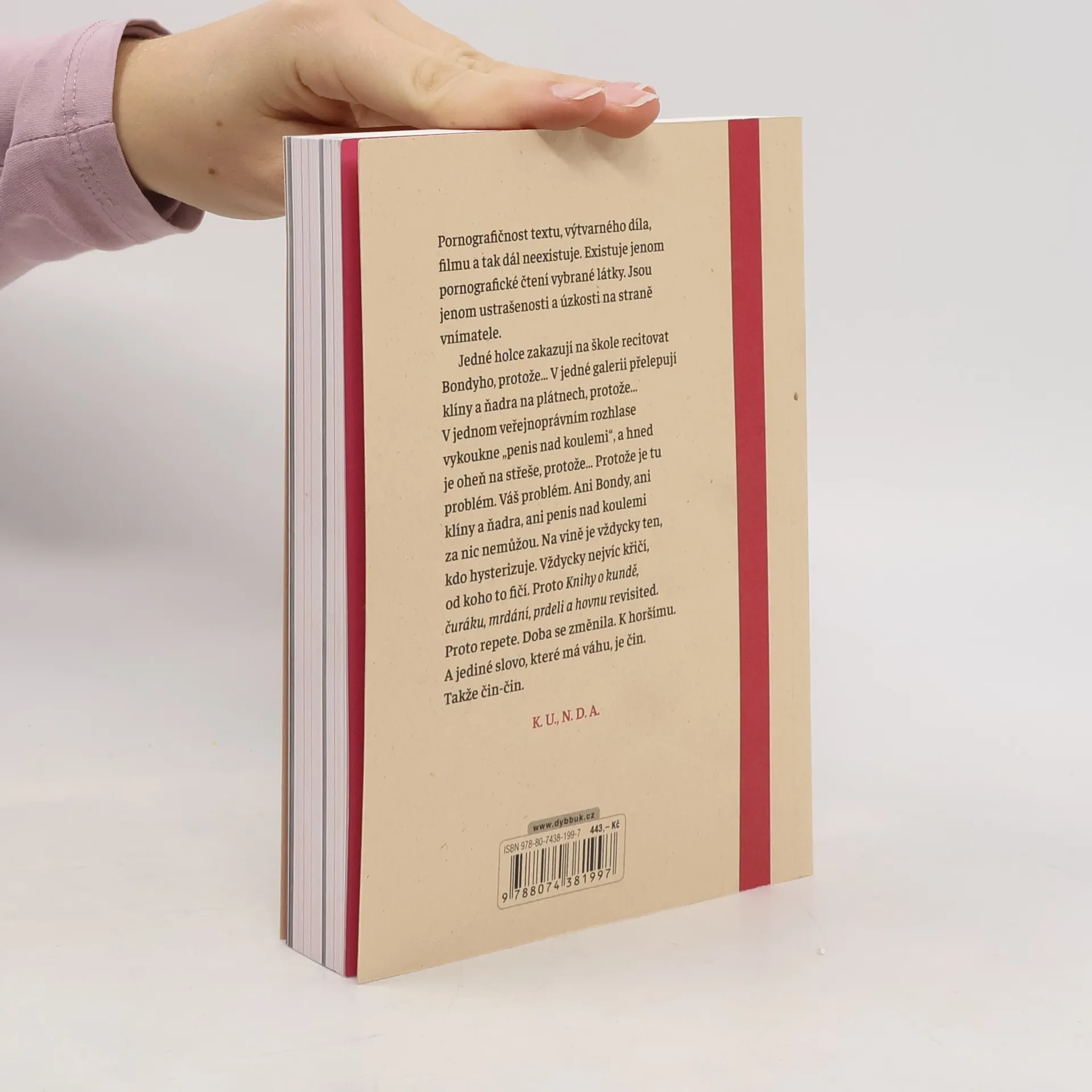 „KNIHA O“ je sbírka více než tří set erotických textů z pera spisovatelů uznávaných, zatracovaných i anonymních, bohatě ilustrovaná výtvarníky napříč staletími. Navazuje na kontroverzní Knihu o kundě a rozšiřuje ji o další texty i díla současných českých umělců. Ať už v literatuře či v umění, erotika je nevysychající pramen fantazie a života… Kunda je cesta, po které sem člověk přišel a ke které se celý život vrací. Když penis stojí, je připraven, a když je připraven, je to neslušnost. I v dnešní době existují tabu, přičemž život ze samotné své povahy přestupuje veškerá omezení… „Pornografičnost textu, výtvarného díla, filmu a tak dál neexistuje. Existuje jenom pornografické čtení vybrané látky. Jsou jenom ustrašenosti a úzkosti na straně vnímatele. Jedné holce zakazují na škole recitovat Bondyho, protože… V jedné galerii přelepují klíny a ňadra na plátnech, protože… V jednom veřejnoprávním rozhlase vykoukne „penis nad koulemi“, a hned je oheň na střeše, protože… Protože je tu problém. Váš problém. Ani Bondy, ani klíny a ňadra, ani penis nad koulemi za nic nemůžou. Na vině je vždycky ten, kdo hysterizuje. Vždycky nejvíc křičí, od koho to fičí. Proto repete. Doba se změnila. K horšímu. A jediné slovo, které má váhu, je čin. Takže čin-čin.“