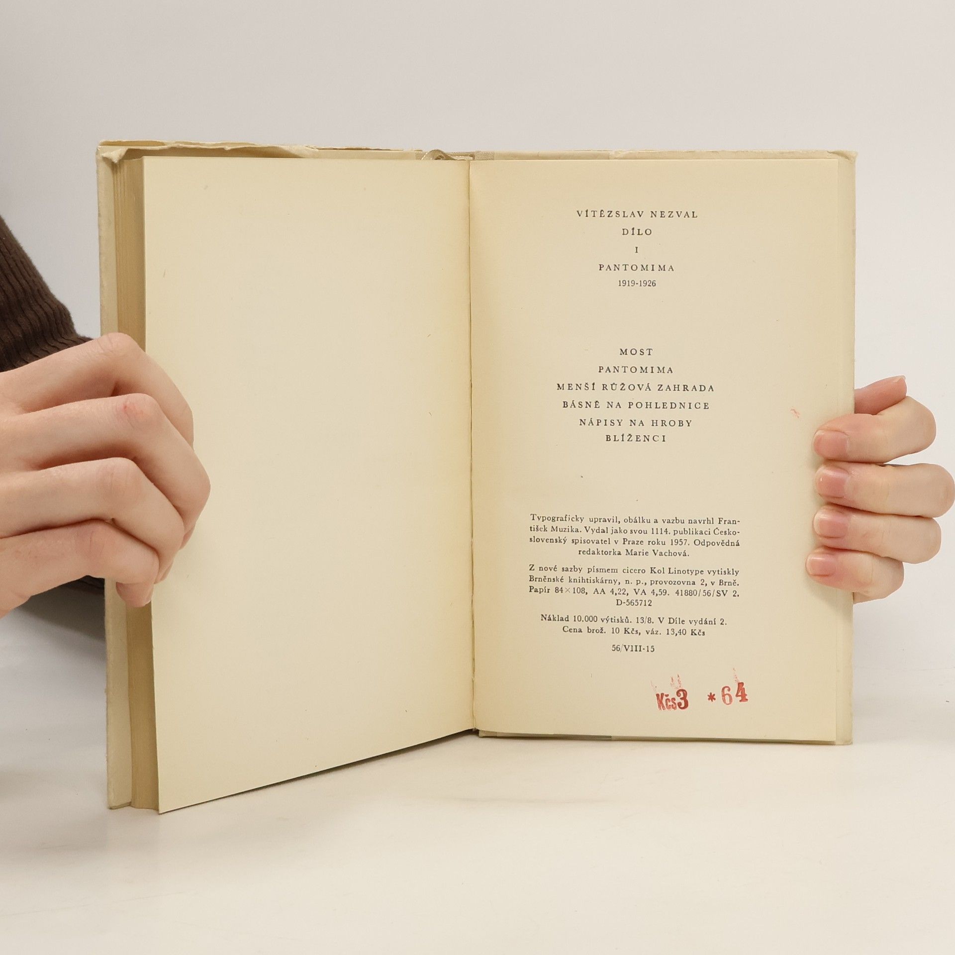 2. vydání v Díle.Obsahuje: Most -- Pantomima -- Menší růžová zahrada -- Básně na pohlednice -- Nápisy na hroby -- Blíženci.
