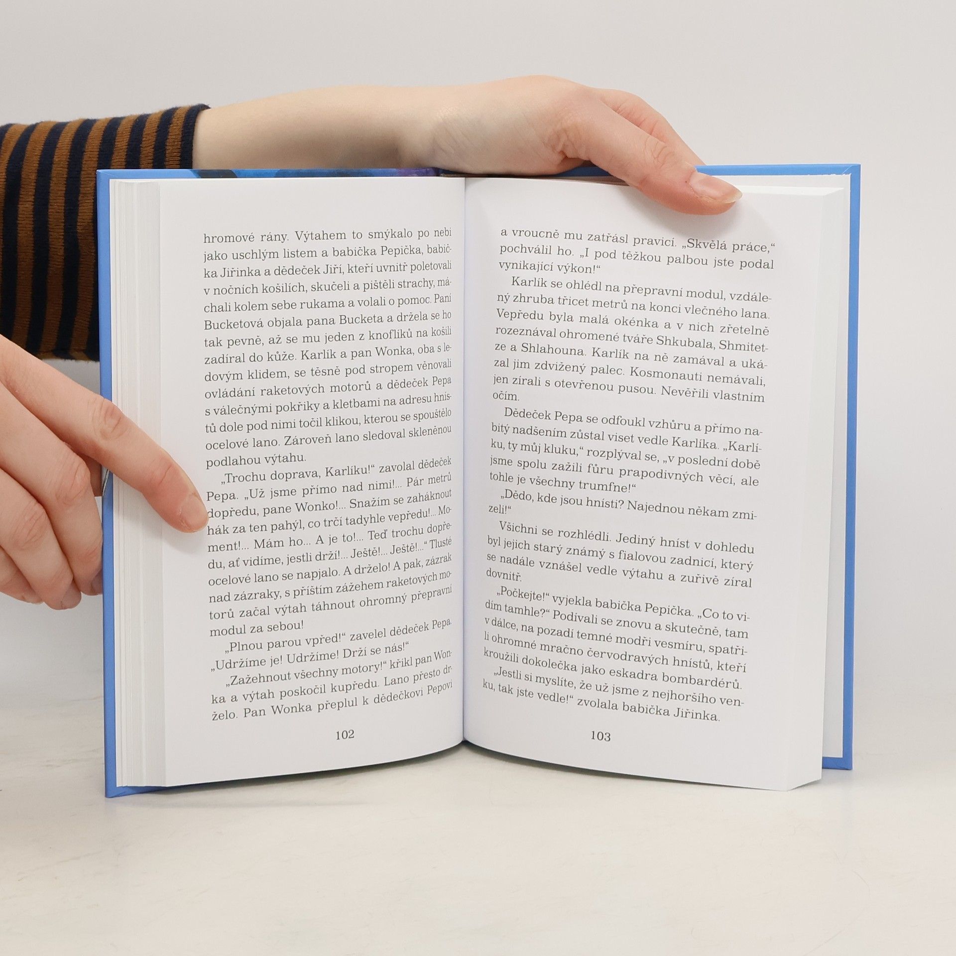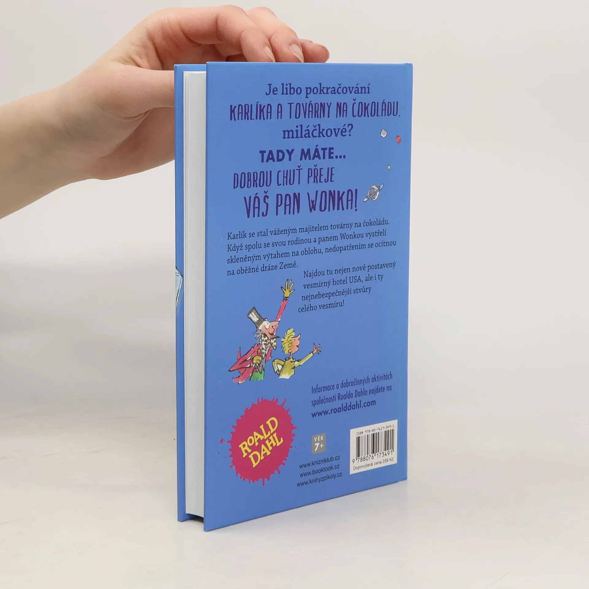 Pozor! Pokračování Karlíka a továrny na čokoládu je tady! Karlík se stal váženým majitelem továrny na čokoládu. Když spolu se svou rodinou a panem Wonkou vystřelí skleněným výtahem na oblohu, nedopatřením se ocitnou na oběžné dráze Země. Najdou tu nejen nově postavený Vesmírný hotel USA, ale i ty nejnebezpečnější stvůry z celého vesmíru. Kniha je určena čtenářům od 7 let.