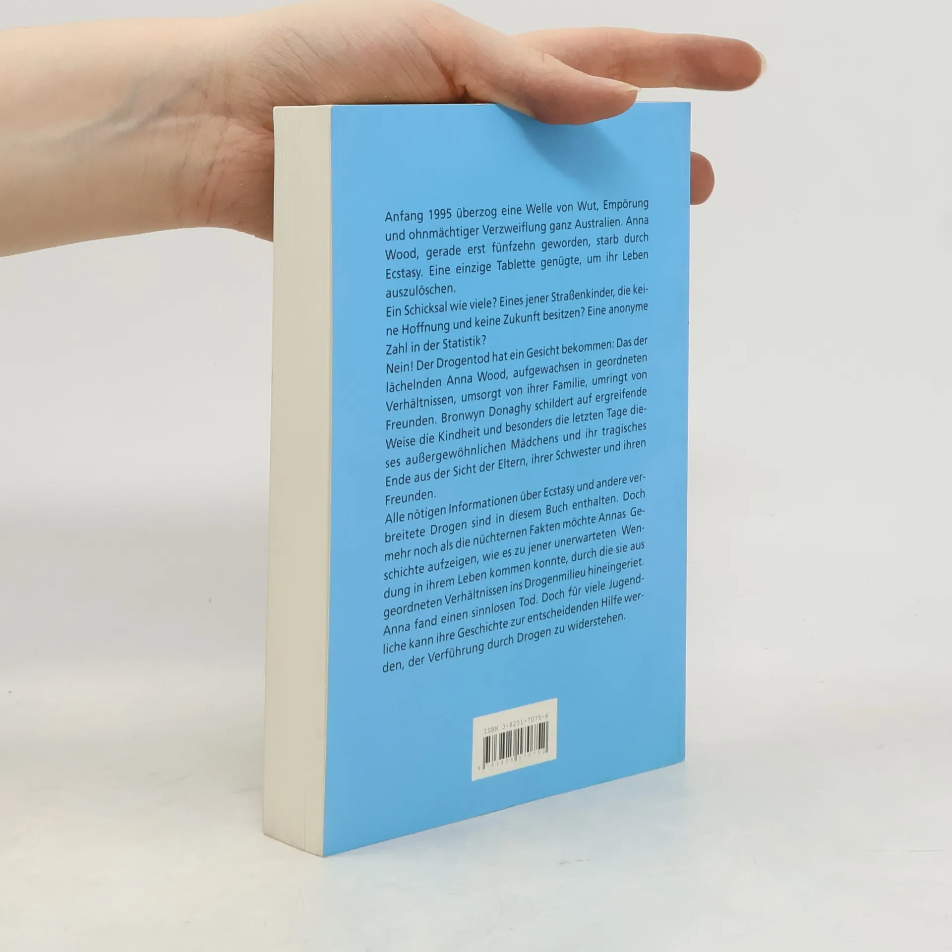 Anna hat mit fünfzehn Jahren ihre erste und einzige Ecstasy-Tablette genommen. Und die wirkte sofort tödlich. Eingestreut in den aufrüttelnden, tragischen Tatsachenbericht von Annas Schicksal sind wichtige Informationen von Fachleuten. Ein Kapitel wendet sich speziell an Teenager. Es verdeutlicht, was Drogen im menschlichen Körper bewirken und demonstriert jungen Menschen die möglichen Konsequenzen einer Entscheidung für oder gegen ein „erstes Mal“.