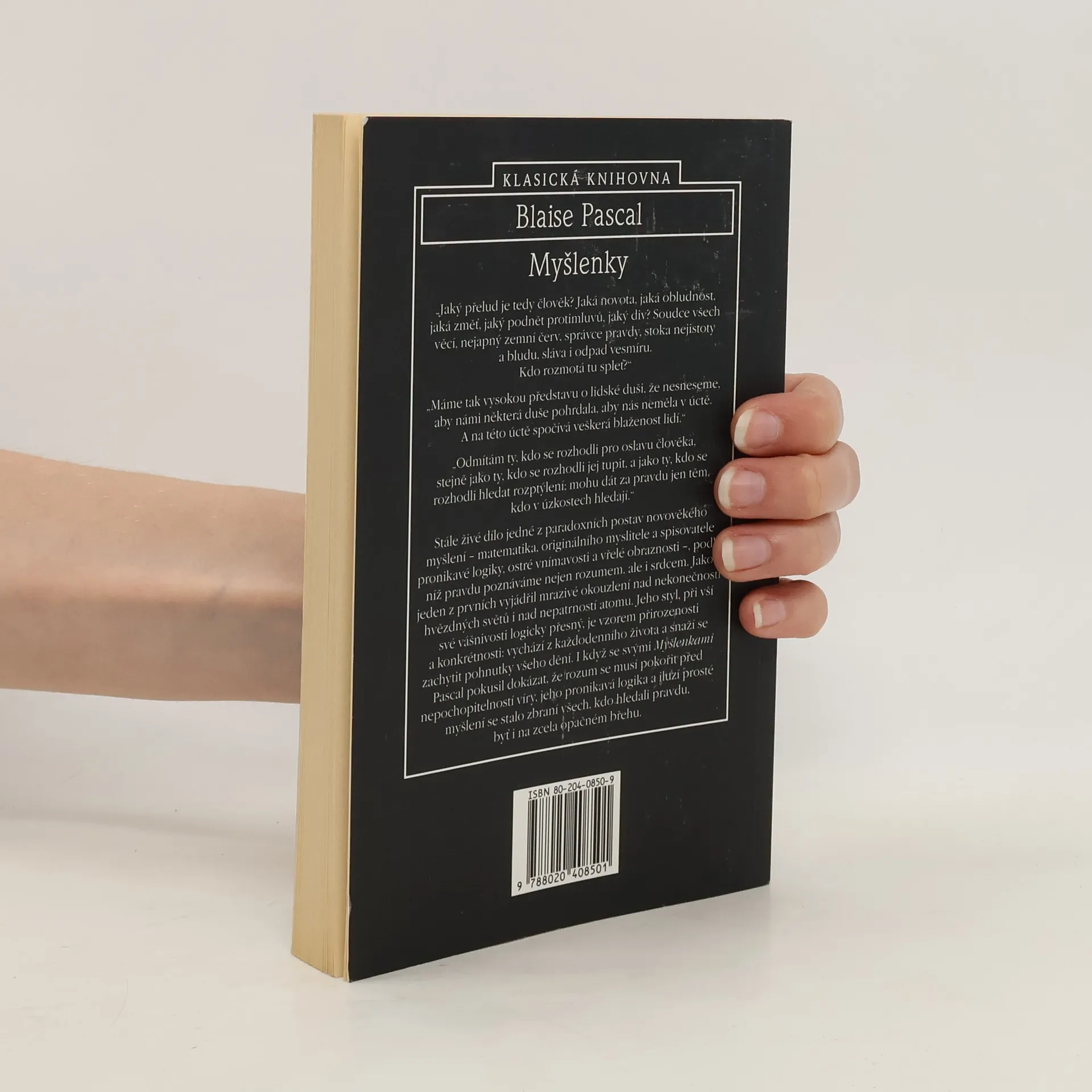 Výbor z nejznámějšího díla francouzského myslitele, přírodovědce a matematika (1623-1662). Nedokončené dílo, které mělo být obranou křestanského náboženství se zachovalo jenom ve zlomcích a proto se stalo v průběhu doby předmětem uspořádávání nejrůznějších editorů. Tento český výbor zachycuje všechna základní témata Pascalových myšlenek v devíti okruzích, ve kterých jsou výroky shromážděny v krátkých, někdy i jednovětých citacích. Autor v nich vyjadřuje svůj pevný postoj jansenistického filozofa k lidskému rozumu, k otázce dobra, k údělu člověka, k náboženství a víře,k lidské pýše, ale i k umění, literatuře a jazyku - postoj, že pravdu je možno poznat nejen rozumem, ale hlavně srdcem. Rozum se musí pokořit před nepochopitelností víry.