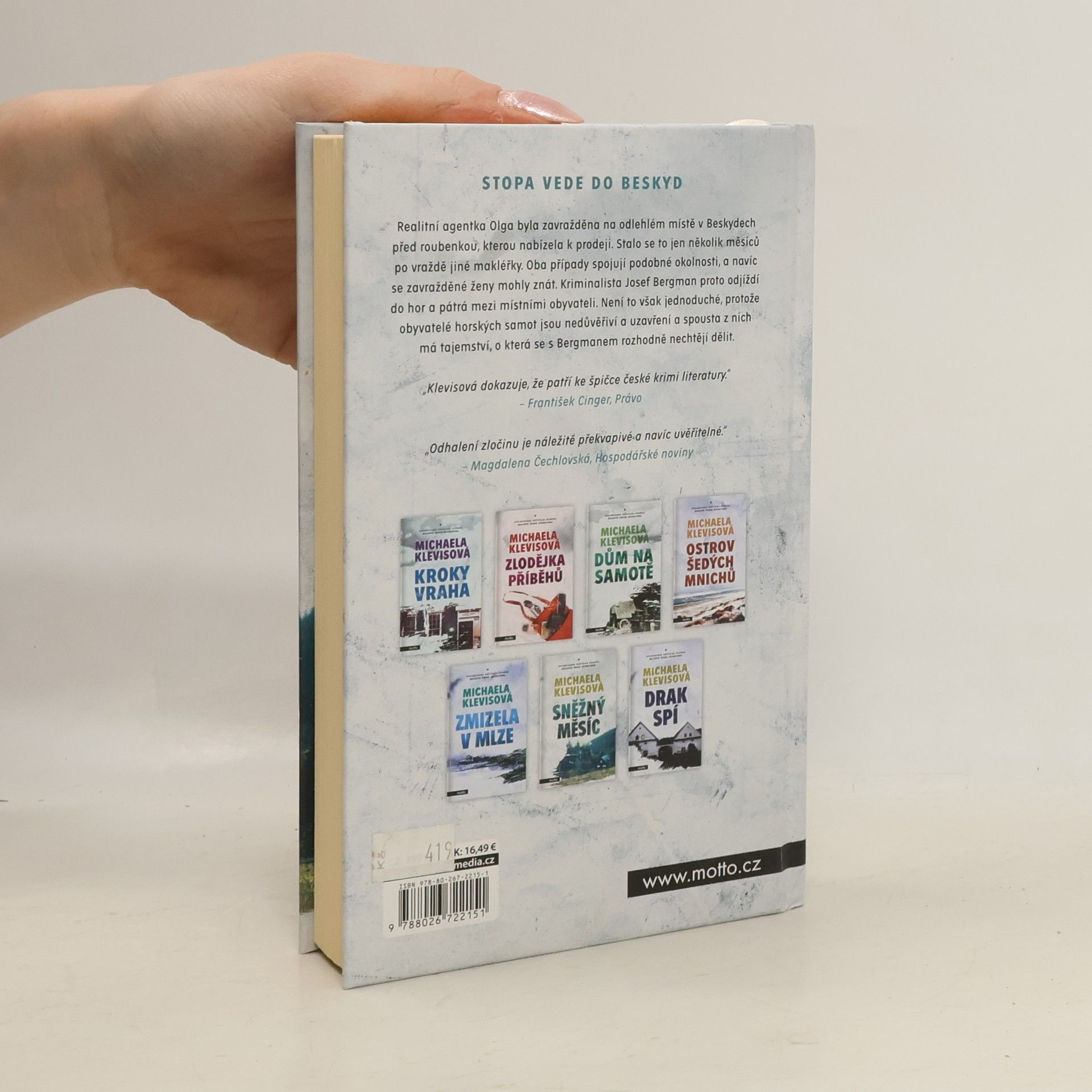 Stopa vede do Beskyd! Nová detektivka Michaely Klevisové zavádí čtenáře do idylické krajiny Beskyd, kde na horách ještě žijí lidé podobně prostě a v souladu s přírodou jako generace jejich předků. I sem ale vstoupil byznys, který staré roubenky mění na hotely a penziony a vše živé v lesích na lovnou zvěř. Realitní agentka Olga byla zavražděna na odlehlém místě vysoko v horách před roubenkou, kterou nabízela k prodeji. Stalo se to jen několik týdnů po vraždě makléřky v Praze. Oba případy spojují podobné okolnosti, a navíc se zavražděné ženy mohly znát. Kriminalista Josef Bergman proto odjíždí do hor a pátrá mezi místními obyvateli. Není to však jednoduché, protože obyvatelé horských samot jsou nedůvěřiví a uzavření a spousta z nich má svá tajemství, o která se s Bergmanem rozhodně dělit nechtějí.