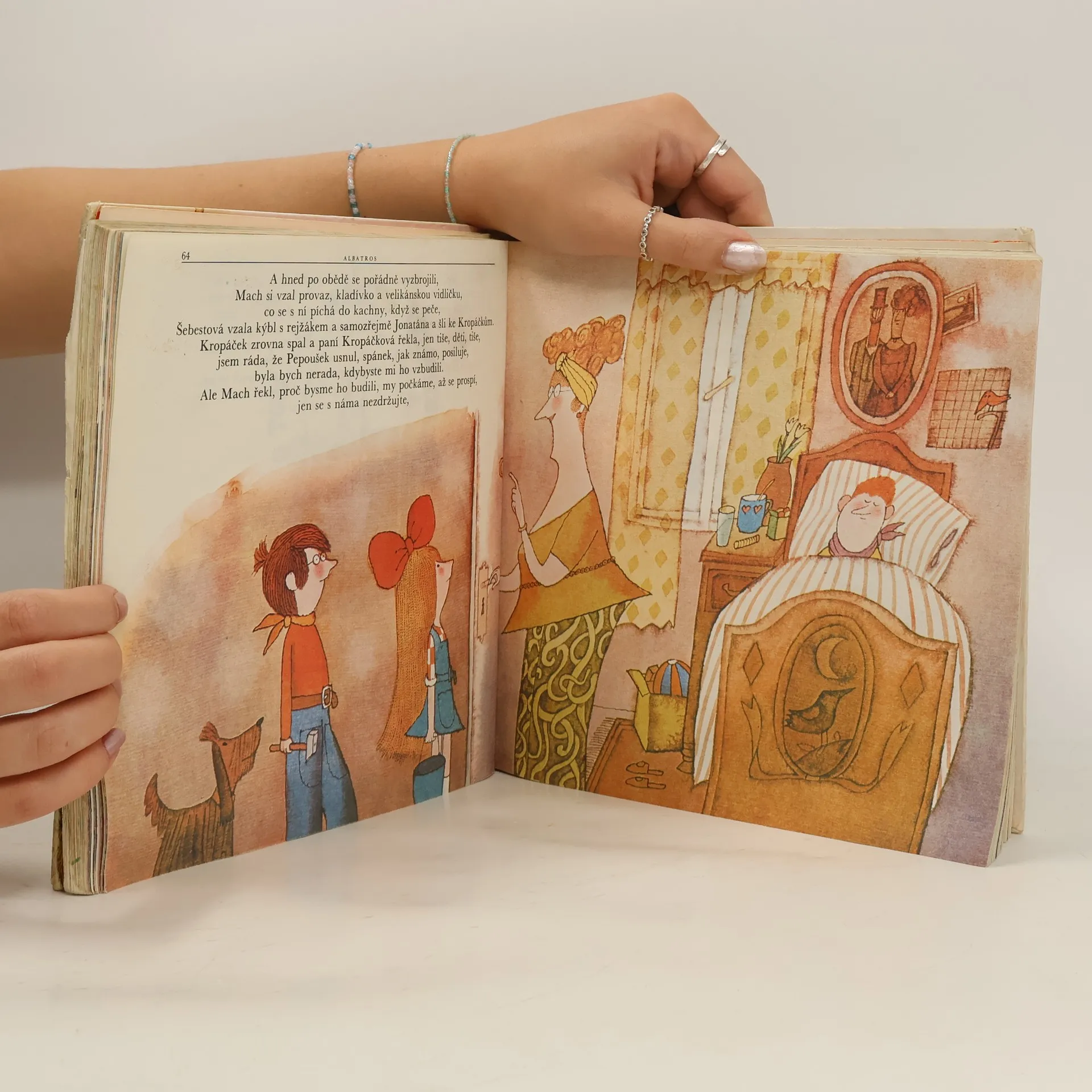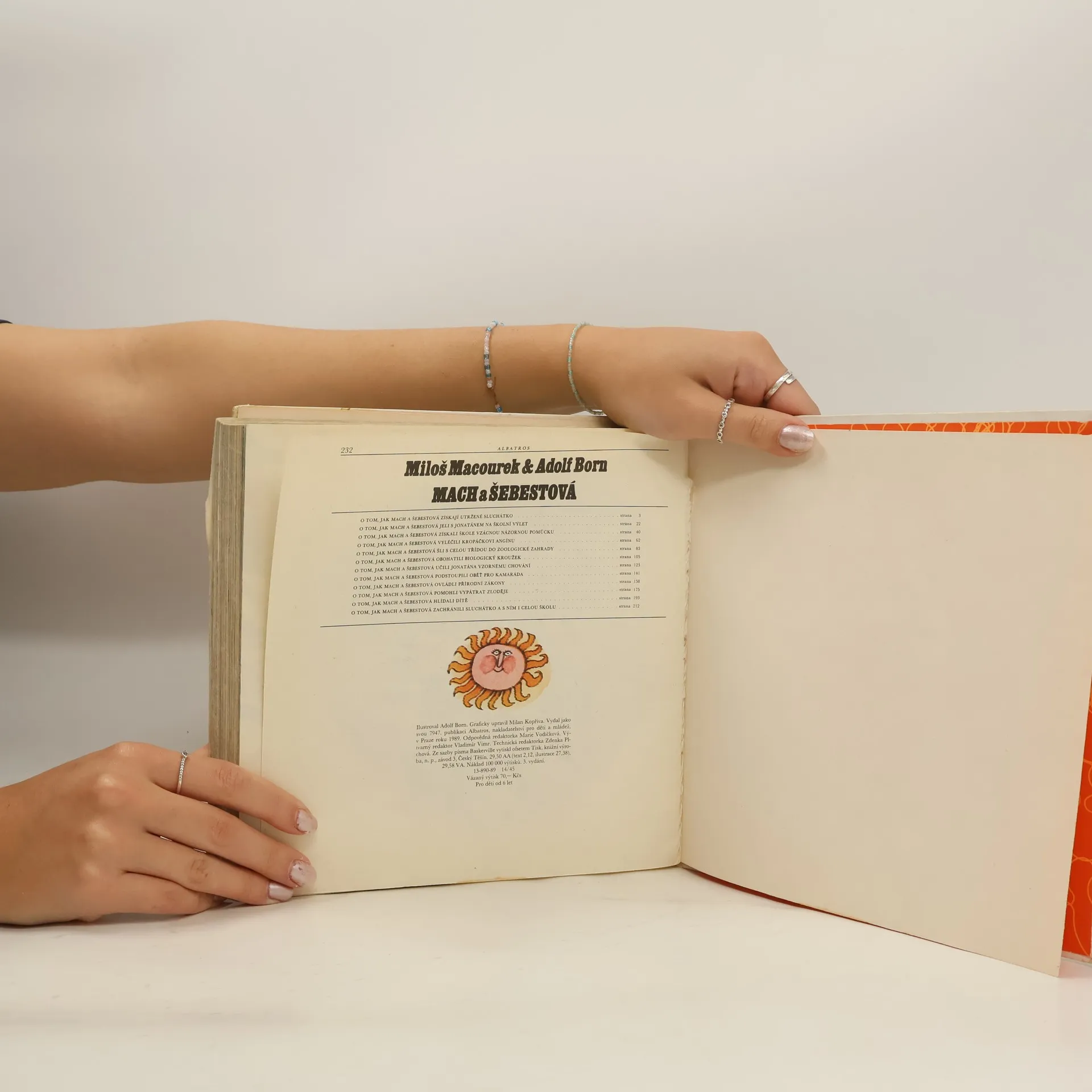 Příběhy oblíbených postaviček Macha, Šebestové a psa Jonatána. Dvanáct humorných kapitol se hlavní postavy pomocí kouzelného sluchátka podívají do doby ledové, přemění psa Jonatána na kluka a vezmou ho na školní výlet nebo pomohou spolužákovi Kropáčkovi s angínou. V epizodách plnýchkomických peripetií, v nichž se mísí skutečnost s bujarým výmyslem uplatnil básník , pohádkář a scénárista Miloš Macourek svůj originální situační i slovní humor, svou hravost a fantazii. Malíř Adolf Born okořenil jeho vyprávění jedinečnými výtvarnými představami.