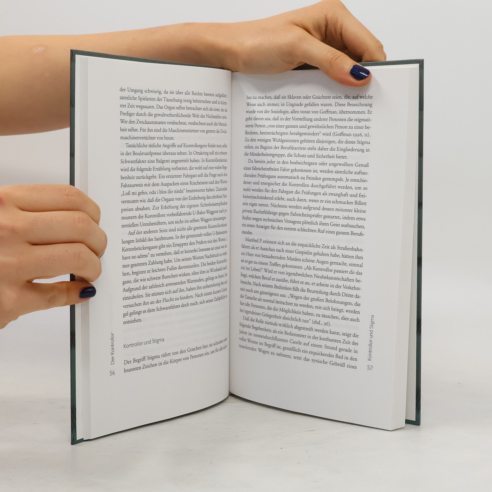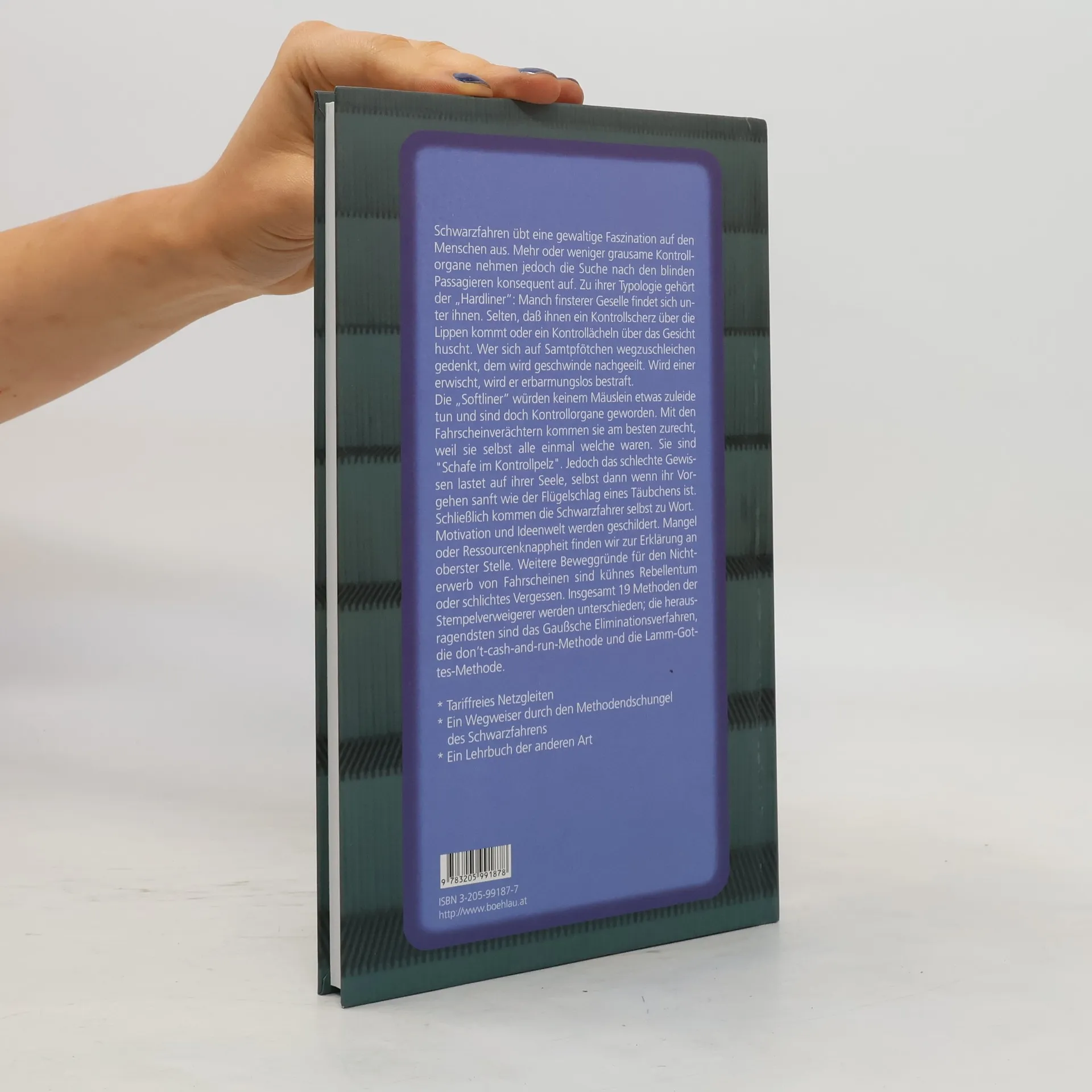 Schwarzfahren übt eine gewaltige Faszination auf den Menschen aus. Mehr oder weniger grausame Kontrollorgane nehmen jedoch die Suche nach den blinden Passagieren konsequent auf. Zu ihrer Typologie gehört der „Hardliner“. Manch finsterer Geselle findet sich unter ihnen. Selten, daß ihnen ein Kontrollscherz über die Lippen kommt oder ein Kontrollächeln über das Gesicht huscht. Wer sich auf Samtpfötchen wegzuschleichen gedenkt, dem wird geschwinde nachgeeilt. Wird einer erwischt, wird er erbarmungslos bestraft. Der „Softliner“ würde keinem Mäuslein etwas zuleide tun und er ist doch Kontrollorgan geworden. Mit den Fahrscheinverächtern kommen sie am besten zurecht, weil sie selbst alle einmal welche waren. Sie sind „Schafe im Kontrollpelz“. Jedoch das schlechte Gewissen lastet auf ihrer Seele, selbst dann wenn ihr Vorgehen sanft wie der Flügelschlag eines Täubchens ist. Schließlich kommen die Schwarzfahrer selbst zu Wort. Motivation und Ideenwelt werden geschildert. Mangel oder Ressourcenknappheit finden wir zur Erklärung an oberster Stelle. Weitere Beweggründe für den Nicht-Erwerb von Fahrscheinen sind kühnes Rebellentum oder schlichtes Vergessen. Insgesamt 19 Methoden der Stempelverweigerer werden unterschieden die herausragendsten sind das Gauß´sche Eliminationsverfahren, die dont-cash-and-run-Methode und die Lamm-Gottes-Methode. Mit einem Vorwort von Roland Girtler.