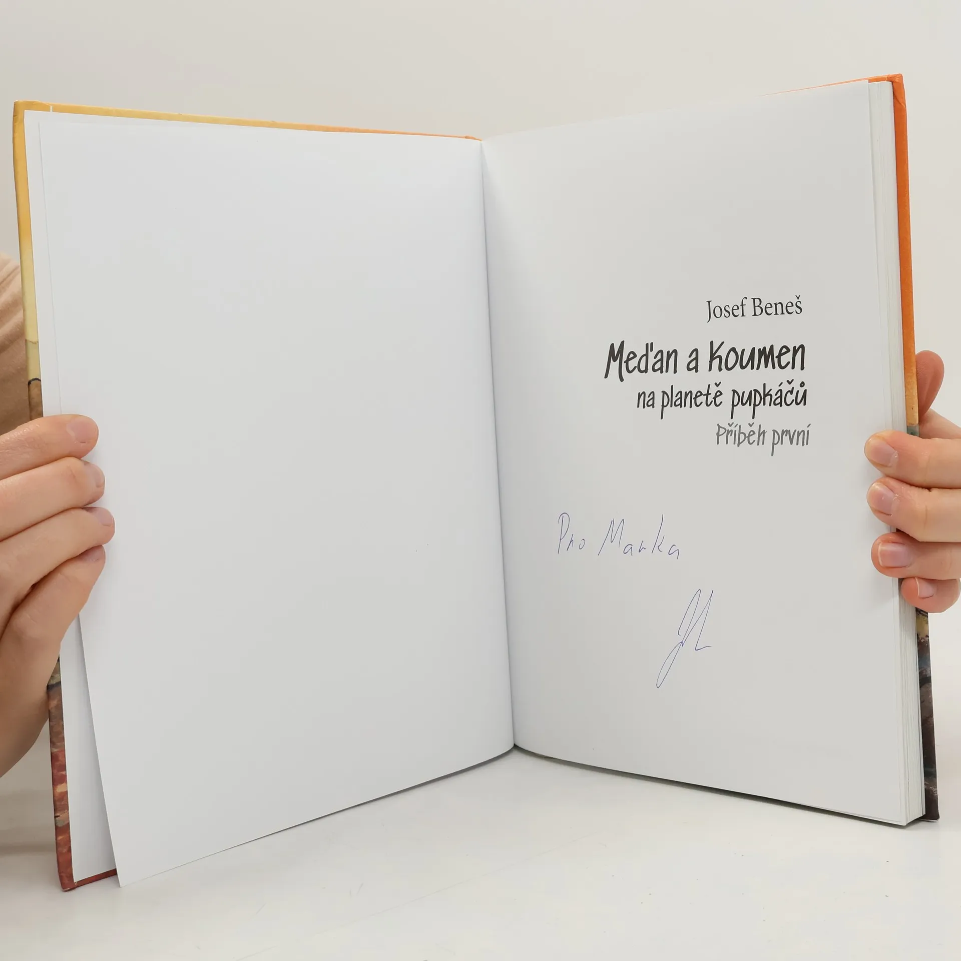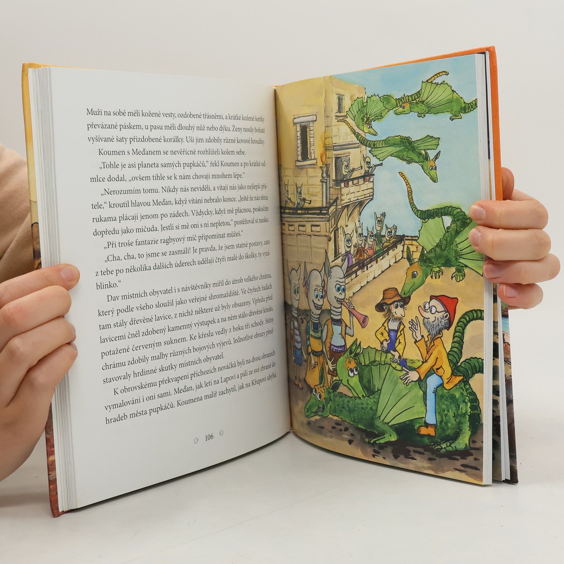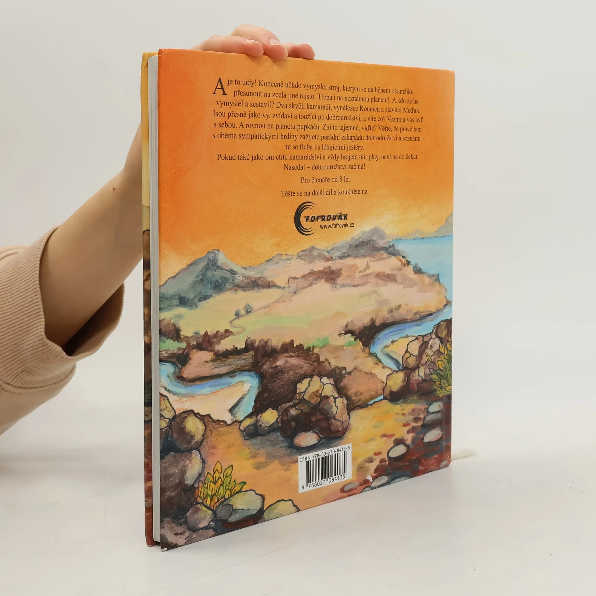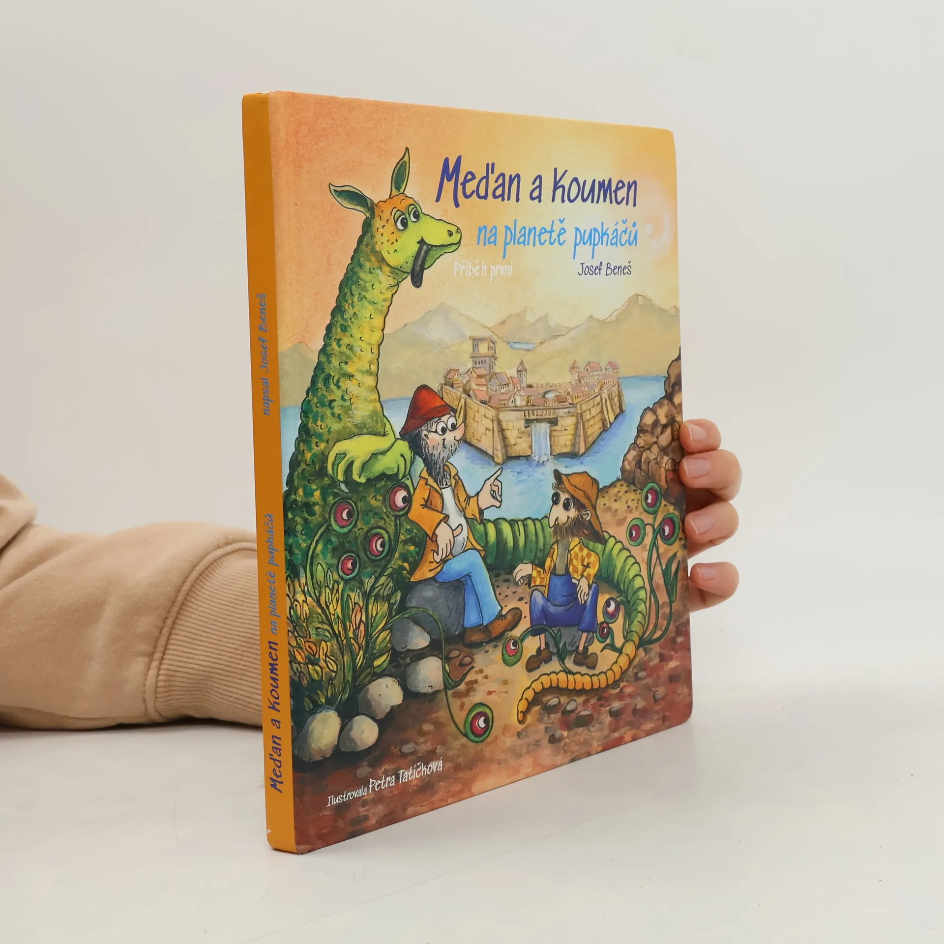 A je to tady! Konečně někdo vymyslel stroj, kterým se dá během okamžiku přesunout na zcela jiné místo. Třeba i na neznámou planetu! A kdo že ho vymyslel a sestavil? Dva skvělí kamarádi, vynálezce Koumen a stavitel Meďan. Jsou přesně jako vy, zvídaví a toužící po dobrodružství, a víte co? Vezmou vás teď s sebou. A rovnou na planetu pupkáčů. Zní to tajemně, že? Věřte, že právě tam s oběma sympatickými hrdiny zažijete parádní eskapádu dobrodružství a seznámíte se třeba i s létajícími ještěry. Pokud také jako oni ctíte kamarádství a vždy hrajete fair play, není na co čekat. Nasedat – dobrodružství začíná!