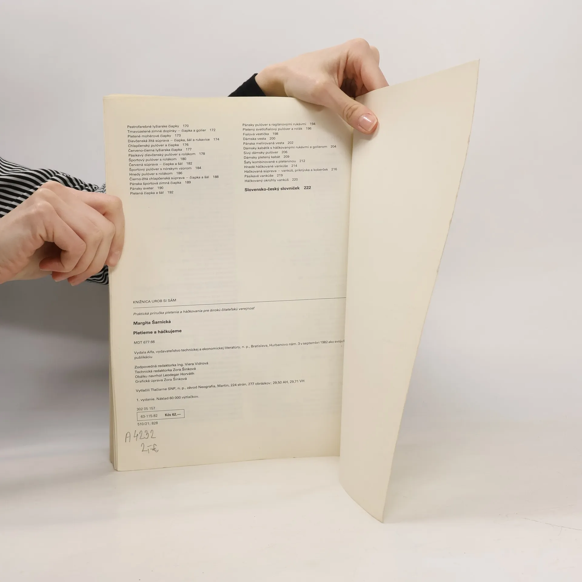 Praktická príručka obsahuje návody na pletené a háčkované odevy pre deti a dospelých, ako aj na bytové doplnky, celkom 118 modelov alebo doplnkov s postupom vyhotovenia.