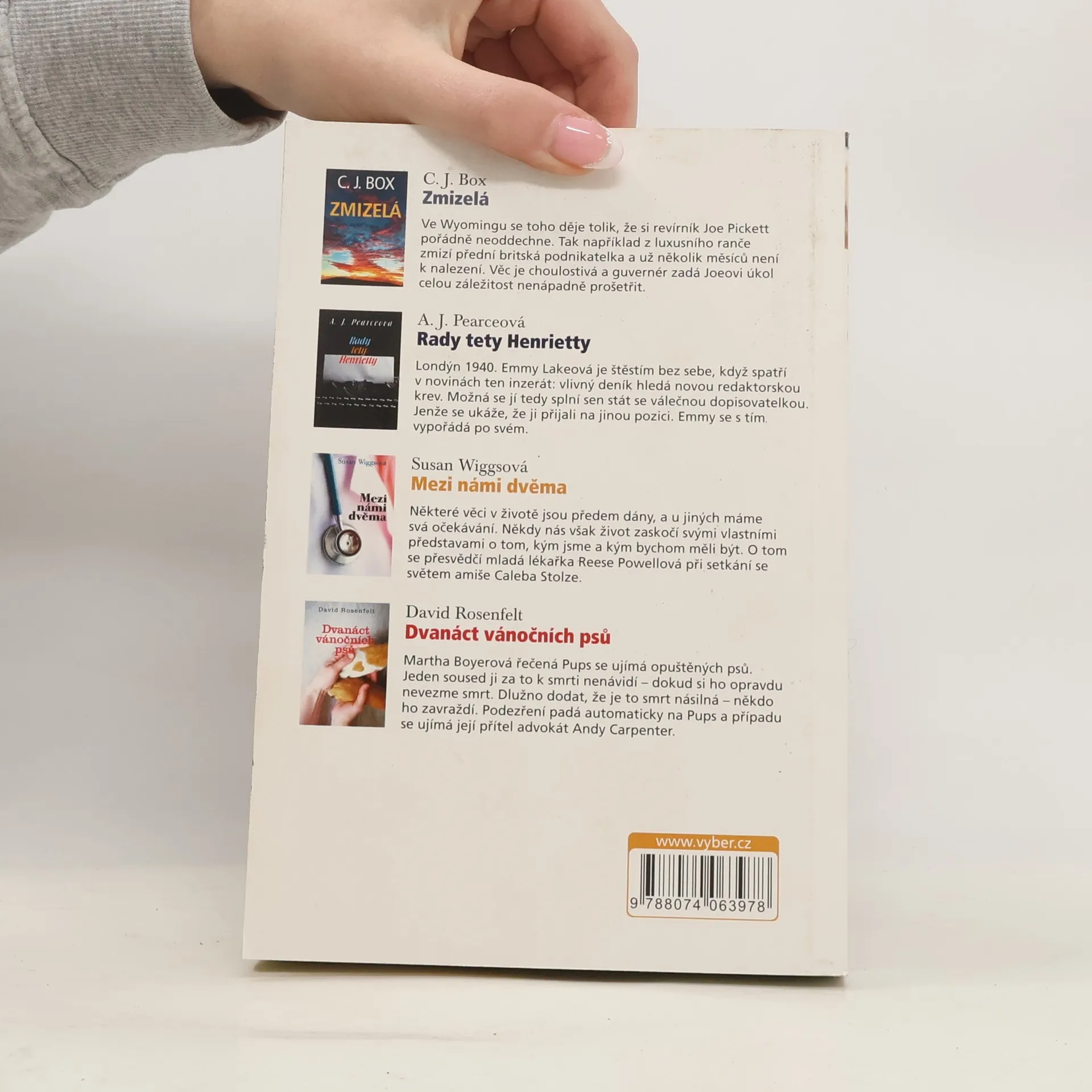 C. J. Box, Zmizelá: z luxusního ranče zmizí britská podnikatelka a guvernér zadá revírníkovi úkol celou záležitost prošetřit. Je tu ale něco, co revírník Joe odhalí a co ho zavede do nebezpečí. A. J. Pearceová: Londýn 1940. Mladá Emmeline si nachází práci v novinách. Potýká se s novou prací a situací ve válečném městě, kde se každý den může stát tragédie. Susan Wiggsová, Mezi námi dvěma: Caleb Stolz vychovává dva sirotky po bratrovi. Je dobrý a odhodlaný, ale v amišské komunitě jde život trochu jinak. A po tragédii se protnou svět Calebův a svět mladé lékařky. David Rosenfelt, Dvanáct vánočních psů: advokát Andy Carpenter se ujímá obhajoby Marthy "Pups" Boyerové, obviněné z vraždy nepříjemného souseda. Najevo vycházejí tajemství z minulosti.
