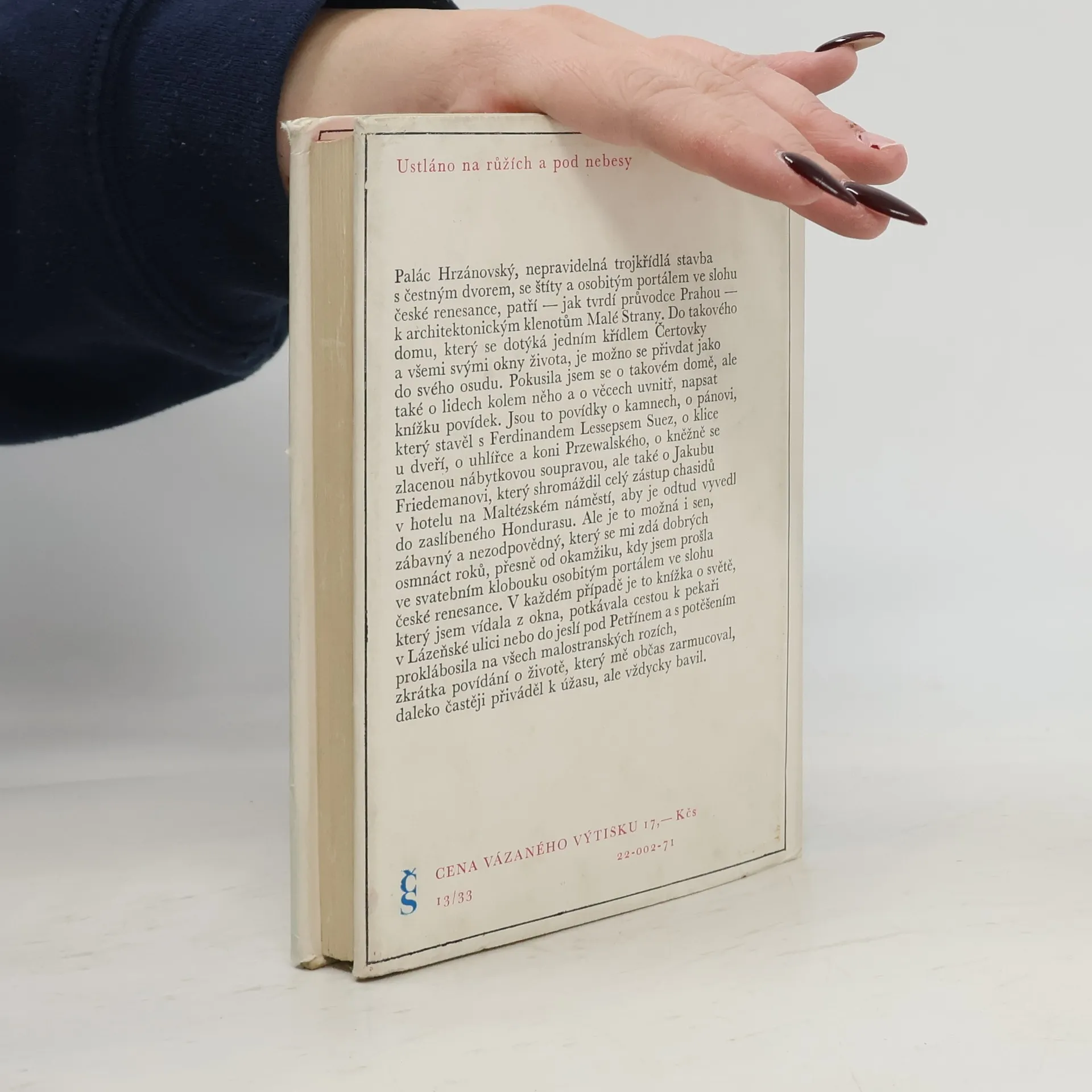 Kniha rozmarně laděných povídek, v nichž příběhy autorčiny rodiny ve starém historickém domě na Kampě v Praze slouží jako východisko vyprávění o lidech, věcech a jevech kolem a o životě na Malé Straně vůbec. Autorka zde doplňuje svou původní povídkovou knihu Ustláno na růžích o sérii povídek Ustláno pod nebesy. Mistrně vyprávěné příběhy o rázovitých malostranských postavách a o jejich životě a světě "zamlada" i o jejich životě dnešním. 1. vydání.
