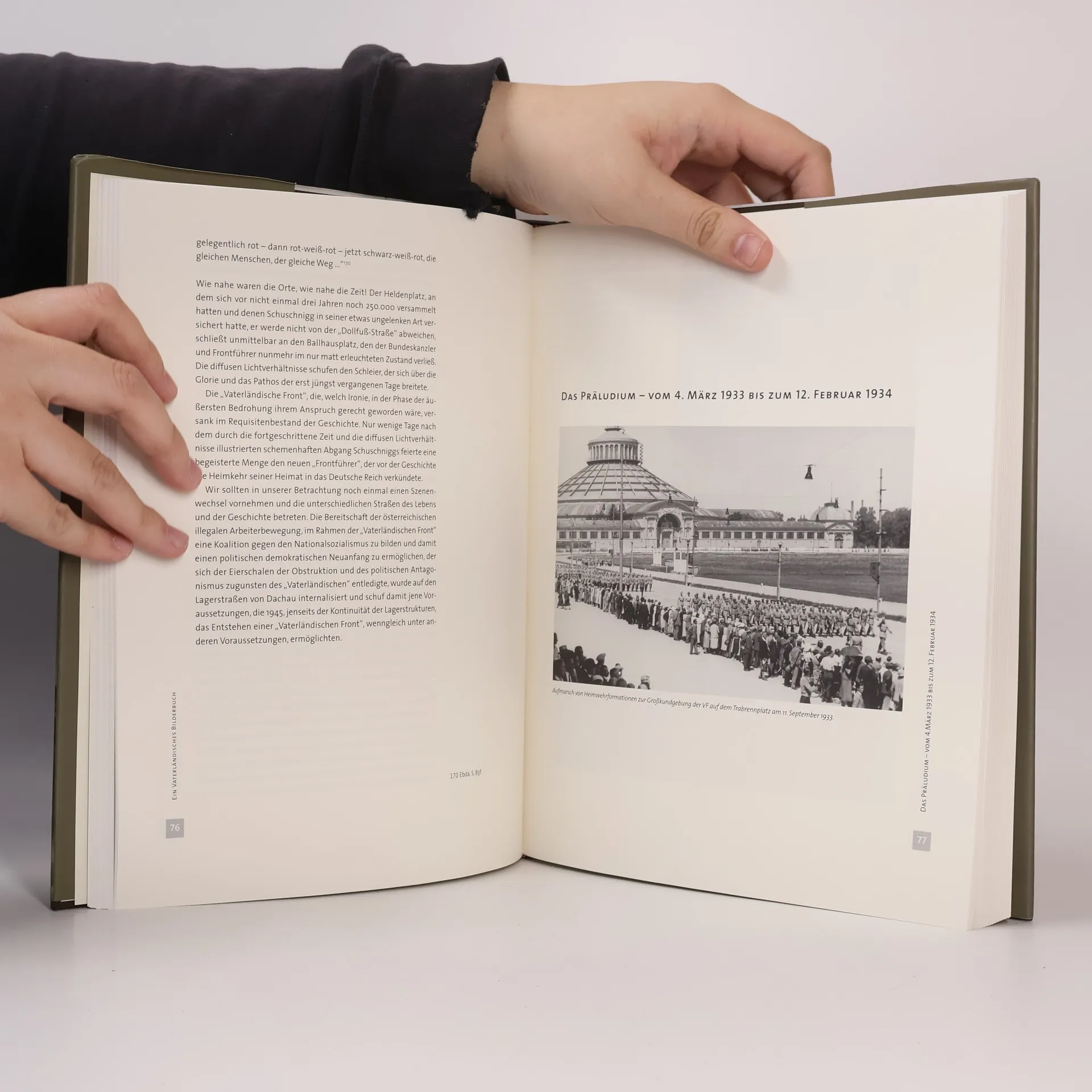 Vergangenheit und Gegenwart sind kulturelle Schöpfungen, die durch Bilder erzählt werden, die erst entschlüsselt werden müssen. Der sinnstiftende Kontext der Interpretation ermöglicht es uns, den „Bildersaal der Geschichte“ zu durchschreiten, der seit der Französischen Revolution tiefgreifende Veränderungen erfahren hat. Das 20. Jahrhundert wurde zum Jahrhundert der Bilder, in dem Fotografie und Film als „Zeugen der Zeit“ fungierten. Während die Presse um 1900 oft Wochen hinter den Ereignissen zurückblieb, verkürzte sich diese Differenz nach dem Ersten Weltkrieg auf Tage und Stunden. Die kollektive Wahrnehmung wurde zunehmend durch die Linse des Fotografen geprägt, und das Pressefoto wurde zum Inbegriff der Wirklichkeit. Die enthaltenen Fotografien illustrieren die Selbstinszenierung der Vaterländischen Front und blenden die Geschichte „von unten“ aus. Themen wie Armut, Arbeitslosigkeit und Hunger bleiben unberücksichtigt, da es sich nicht um eine Sozialreportage handelt. Als Dokumente der defensiven Selbstinszenierung gegenüber dem Nationalsozialismus legen sie jedoch die Strukturen und den imitativen Charakter der propagandistischen Bemühungen offen. In diesem Kontext verlieren sie ihren musealen Charakter und bieten dem Betrachter eine lesbare Schrift.