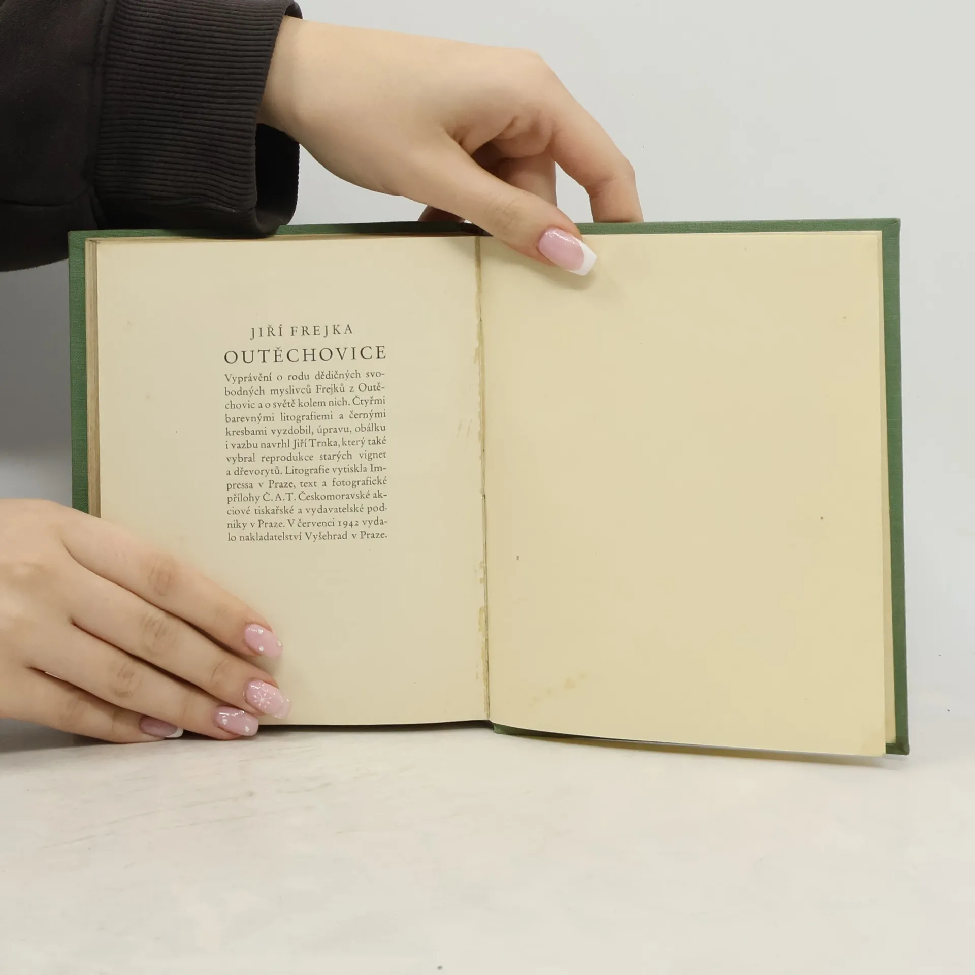 Vyprávění o rodu dědičných svobodných myslivců Frejků v Outěchovicích a o světě kolem nich. Obálka a 4 barevné litografie Frejkův přítel Jiří Trnka. 1. vydání.