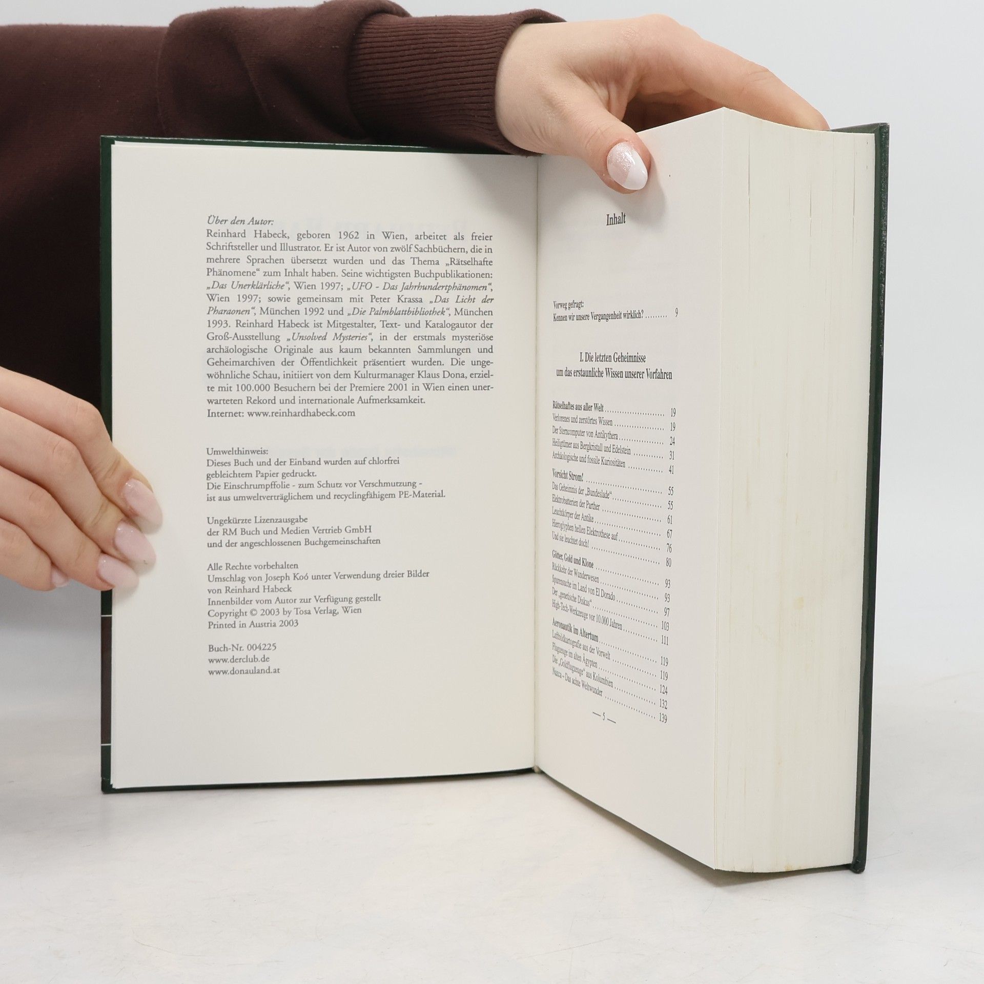 Mit dem Untertitel: Was verbergen die Geheimnisse der Urzeit? Es gibt zahlreiche Rätsel, die von Forschern nicht zufriedenstellend erklärt werden konnten und die eigentlich nicht existieren sollten: Wer hinterließ vor Millionen Jahren versteinerten Fußabdrücke? Wie ist es möglich, dass archäologische Artefakte präzise Kenntnisse der Embryologie und Genetik enthalten? Was ist mit den miniaturisierten prähistorischen Flugzeugen aus Holz und Gold? Hatten primitive Völker Zugang zu prähistorischen Batterien? Zeigen Reliefs aus der Zeit der Pharaonen elektrotechnische Details? Wozu dienten im Altertum Lupen? Welche Methoden wurden zur Bearbeitung der Kristallschädel der Maya und Azteken verwendet? Wer konstruierte den „Sternencomputer“ von Antikythera? Wer entschlüsselt unleserliche Schriften? Warum wurden die kilometerlangen Linien auf der Nazca-Ebene geschaffen? Welche Geheimnisse birgt die „Kammer des Wissens“? Woher hatten die altägyptischen Priester ihr tiefes Wissen? Gab es in der Urzeit eine hochentwickelte Kultur? Wurde die verlorene Atlantis gefunden? Was ist die „Unterwasserstadt“ bei Okinawa? Was bleibt, wenn unsere Kultur untergeht? Hatten prähistorische Völker Kontakte mit Außerirdischen? Der Autor Reinhard Habeck beschäftigt sich mit diesen Fragen und zeigt anhand neuer Funde, dass unsere Vergangenheit offenbar fantastischer war, als es die Lehrbücher behaupten.