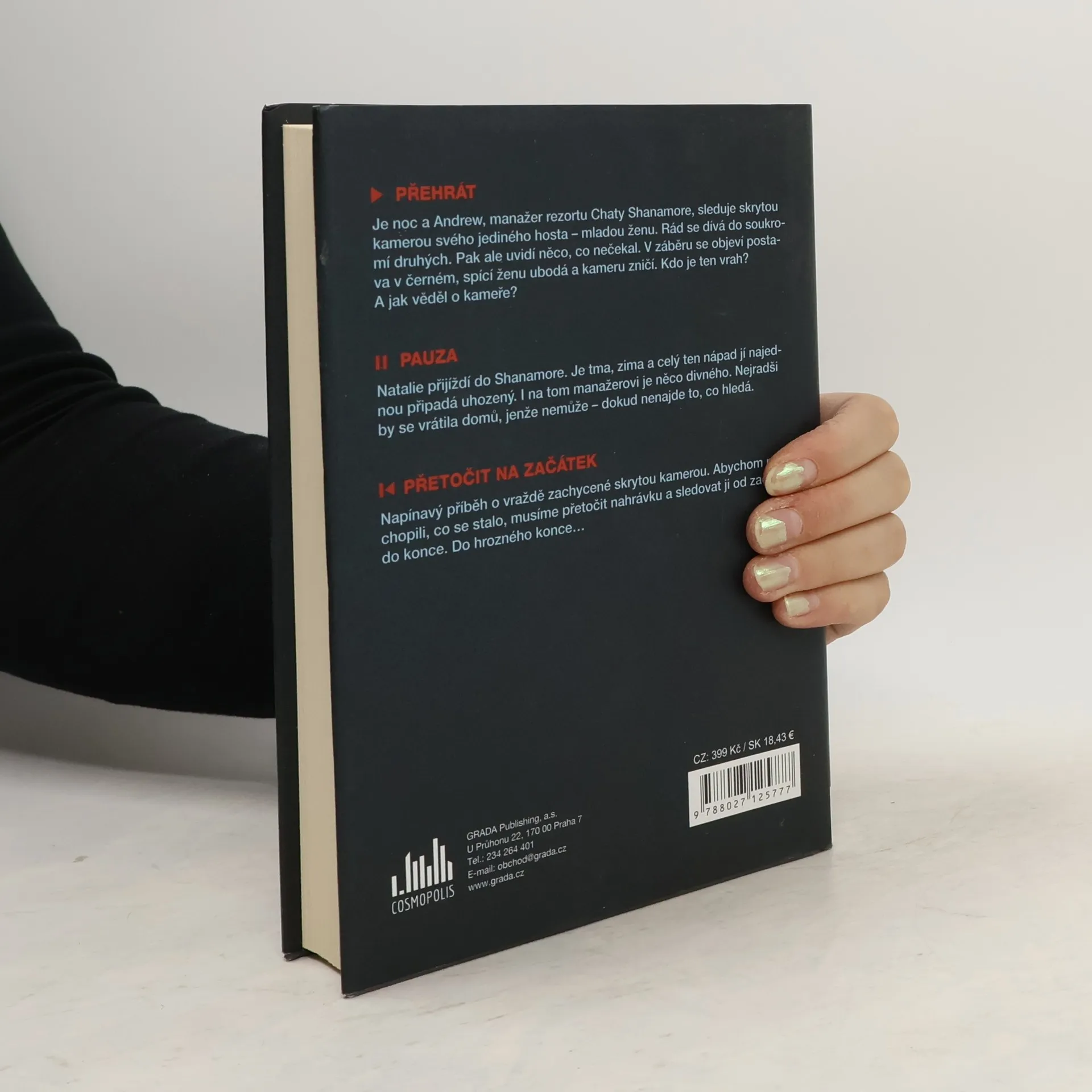 PŘEHRÁT Je noc a Andrew, manažer rezortu Chaty Shanamore, sleduje skrytou kamerou svého jediného hosta – mladou ženu. Rád se dívá do soukromí druhých. Pak ale uvidí něco, co nečekal. V záběru se objeví postava v černém, spící ženu ubodá a kameru zničí. Kdo je ten vrah? A jak věděl o kameře? PAUZA Natalie přijíždí do Shanamore. Je tma, zima a celý ten nápad jí najednou připadá uhozený. I na tom manažerovi je něco divného. Nejradši by se vrátila domů, jenže nemůže – dokud nenajde to, co hledá. PŘETOČIT NA ZAČÁTEK Napínavý příběh o vraždě zachycené skrytou kamerou. Abychom pochopili, co se stalo, musíme přetočit nahrávku a sledovat ji od začátku do konce. Do hrozného konce…