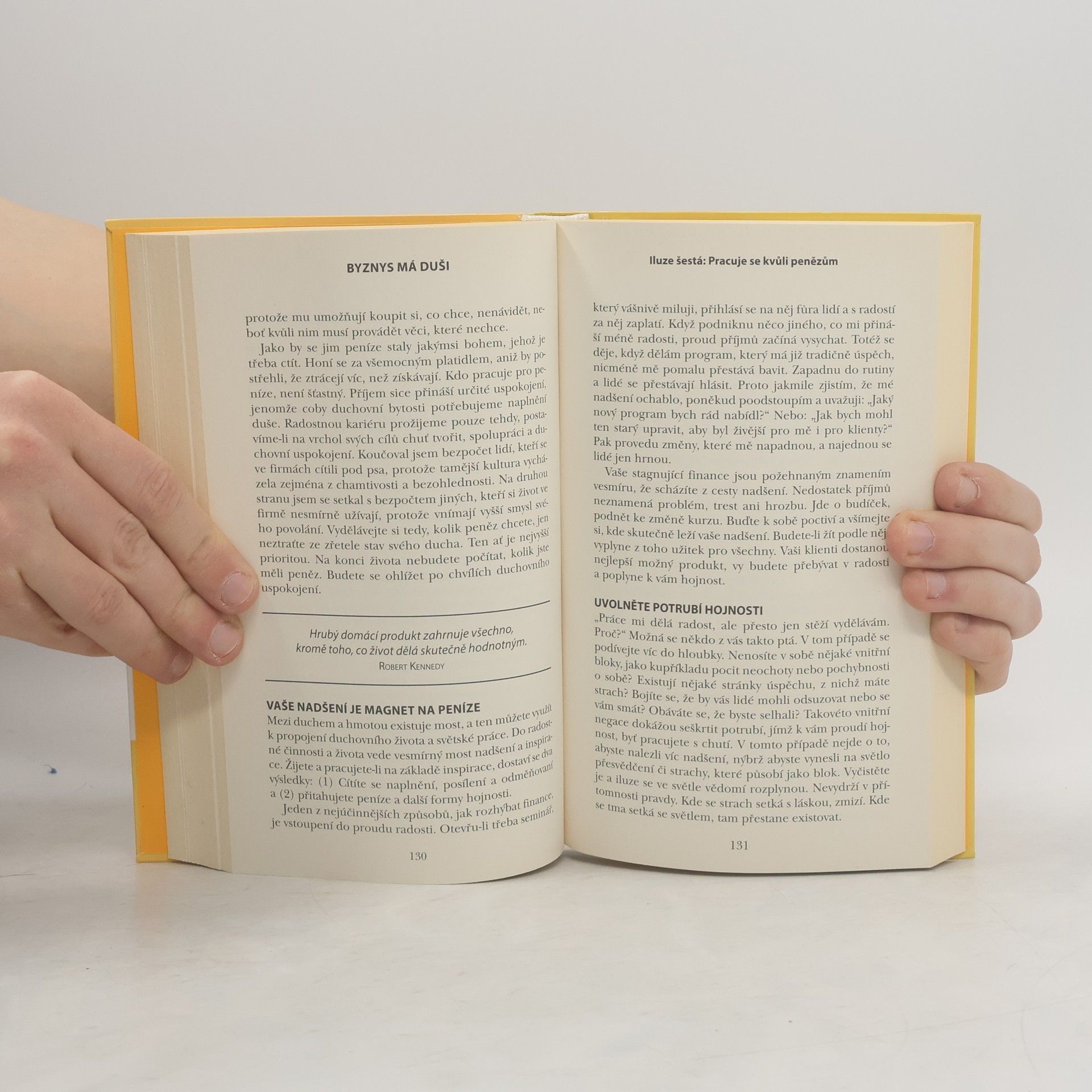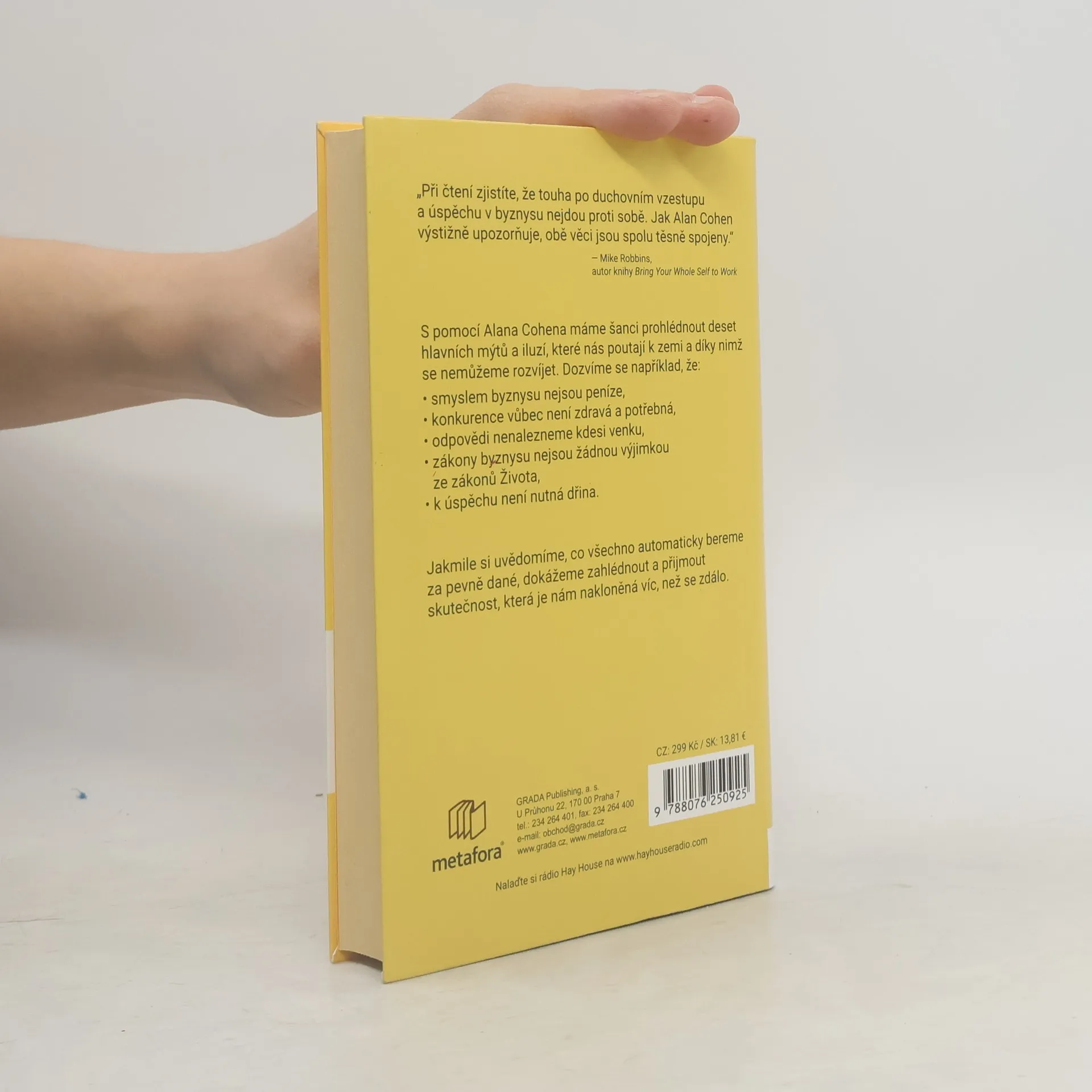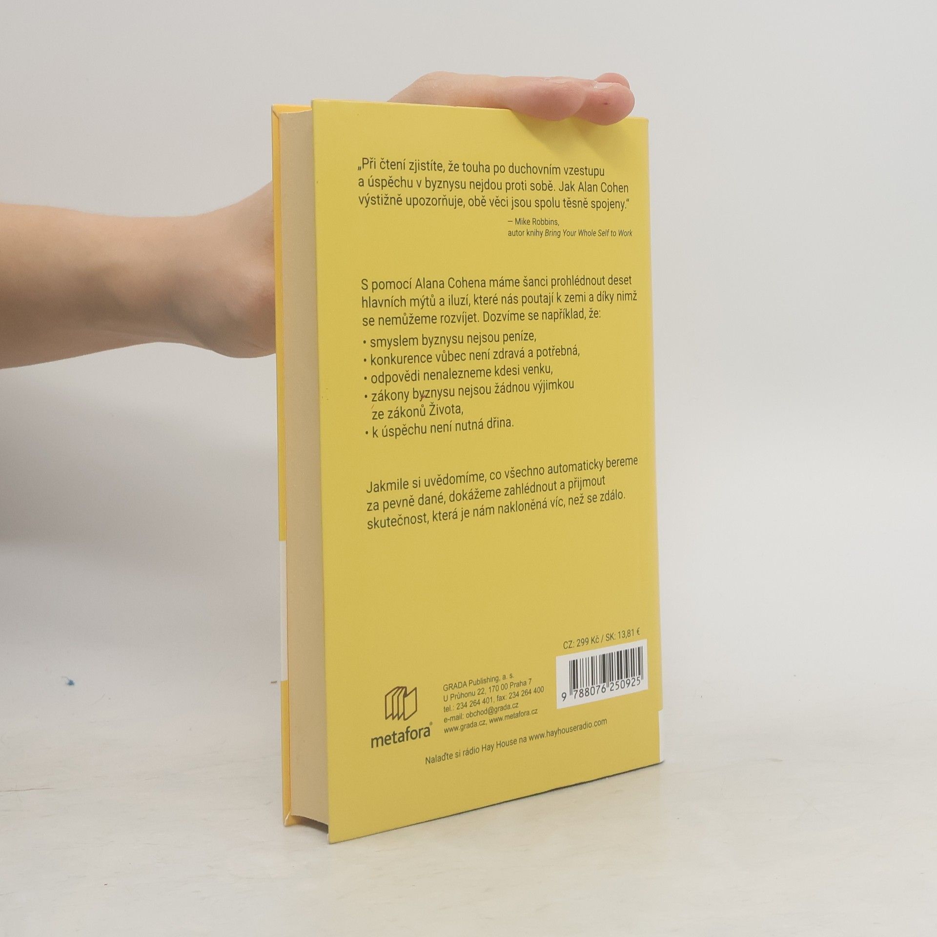 Všichni toužíme po úspěchu a prosperitě, aniž bychom obětovali svou duši a duchovní cestu. Celosvětově uznávaný kouč Alan Cohen tvrdí, že je to možné. Při práci a podnikání se totiž nesetkáváme pouze s vnějšími okolnostmi, ale především s našimi podvědomými představami. Snadno se zbavíme očividných lží, ale obtížnější je rozloučit se s hluboce zakořeněnými mýty, které ovlivňují celou společnost. Cohen nám pomáhá prohlédnout deset hlavních mýtů a iluzí, které nás omezují, jako například: smyslem byznysu jsou peníze, konkurence je zdravá, odpovědi je třeba hledat venku, a úspěch vyžaduje dřinu. Když si uvědomíme, které iluze považujeme za samozřejmé, můžeme se osvobodit a spatřit, že skutečnost je mnohem jednodušší. Vesmír nám dává vše, co potřebujeme, a jakmile se zbavíme našich mýtů, otevřeme se hojnosti. Cohen identifikoval tři skupiny lidí, kteří se potýkají s otázkami peněz a duchovního života. Někteří mají skvělou pracovní pozici, ale trpí rutinou, jiní pracují příliš za málo peněz a hledají svobodu, a třetí preferují kreativitu, ale potřebují se také uživit. Kniha oslovuje všechny tyto skupiny a ukazuje, jak dosáhnout kariérního úspěchu, zatímco se věnujeme svým zálibám a poslání.