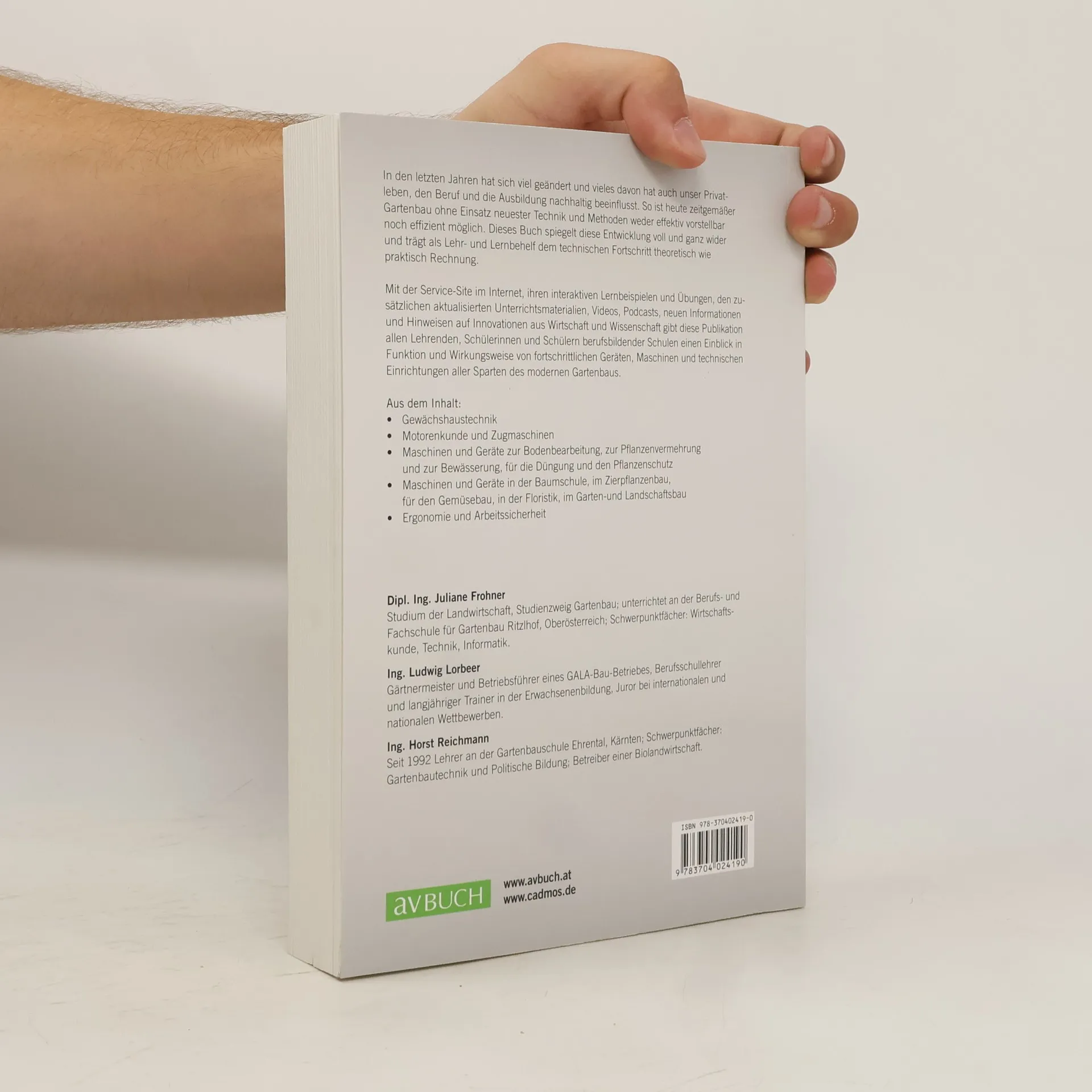 Moderner Gartenbau ist ohne Einsatz von Technik heute kaum noch vorstellbar. In nahezu allen Sparten des Dienstleistungsgartenbaus sind es Geräte, Maschinen und technische Einrichtungen, die die oft beschwerlichen Arbeitsabläufe erleichtern. Um am umkämpften Markt zu reüssieren benötigen Produktionsbetriebe zeitgemäße Gewächshaustechnik, Klimasteuerung, Dünge- und Pflanzenschutz-technik, um den Pflanzen naturnahe Wachstumsbedingungen zu verschaffen. Dieses Buch gibt Lehrenden, Schülerinnen und Schülern berufsbildender Schulen einen Einblick in Funktion und Wirkungsweise von Geräten, Maschinen und technischen Einrichtungen aller Sparten des modernen Gartenbaus. Eine umfassende Ergänzung bieten die Webportale von avBUCH. net: Eine Site für Lehrende, eine Site für Schülerinnen und Schüler, auf der interaktive Übungen, aktuelle Lehr- und Lernbehelfe, zusätzliche Unterrichtsmaterialien, Videos, Podcasts, neue Informationen und Hinweise auf Innovationen aus Wirtschaft und Wissenschaft zu finden sind.