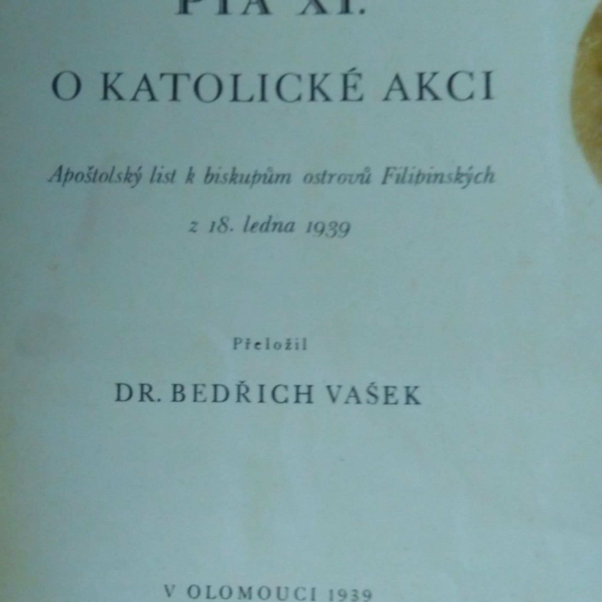 Poslední slovo papeže Pia XI. o katolické akci : apoštolský list k biskupům ostrovů Filipinských z 18. ledna 1939, Pius