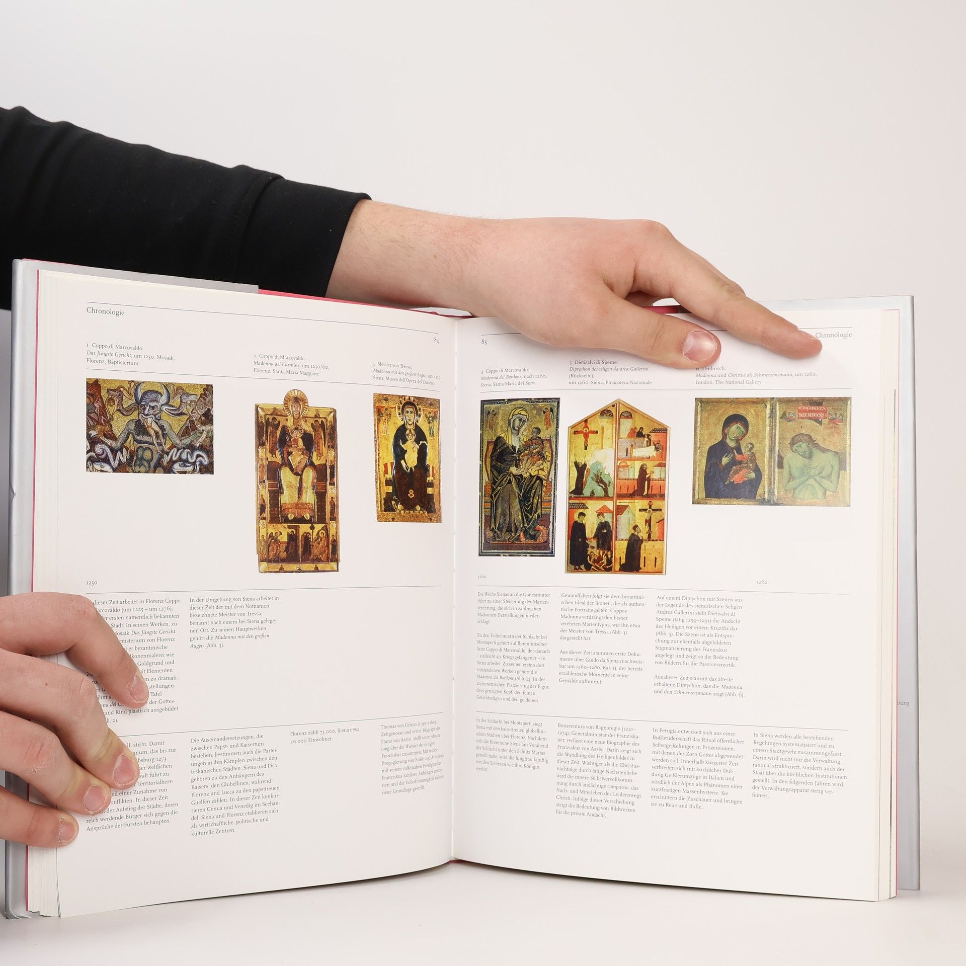 In Siena und Florenz begann um 1300 eine künstlerische Entwicklung, die ein neues Bildverständnis hervorbrachte: Freude am Erzählen, ausschmückende Details und die Entdeckung von Raum und Landschaft führten weg von der mittelalterlichen Strenge der Gotik. In Italien wandelte sich die feierliche Malerei auf Goldgrund zuerst zur lebensnahen Darstellung von Mensch und Natur in der Renaissance. Im Lauf von zwei Jahrhunderten traten die Figuren aus der raum- und zeitlosen Sphäre einer sakralen überirdischen Welt in die Lebenswirklichkeit des Betrachters. In dieser Zeit löste sich das Gemälde aus den bis dahin bestehenden Zusammenhängen in Freskenzyklen, Buchillustrationen und Altarmalerei. Das Katalogbuch zur Ausstellung dokumentiert anhand charakteristischer Werke die Entstehung der neuzeitlichen Malerei. Die Leihgaben stammen aus dem Lindenau-Museum Altenburg, das über die größte Sammlung früher italienischer Gemälde in Deutschland verfügt. Die einführenden Aufsätze widmen sich den zentralen Aspekten der italienischen Malerei von 1300 bis 1500 und charakterisieren den Sammler Bernhard August von Lindenau (1779 –1854).