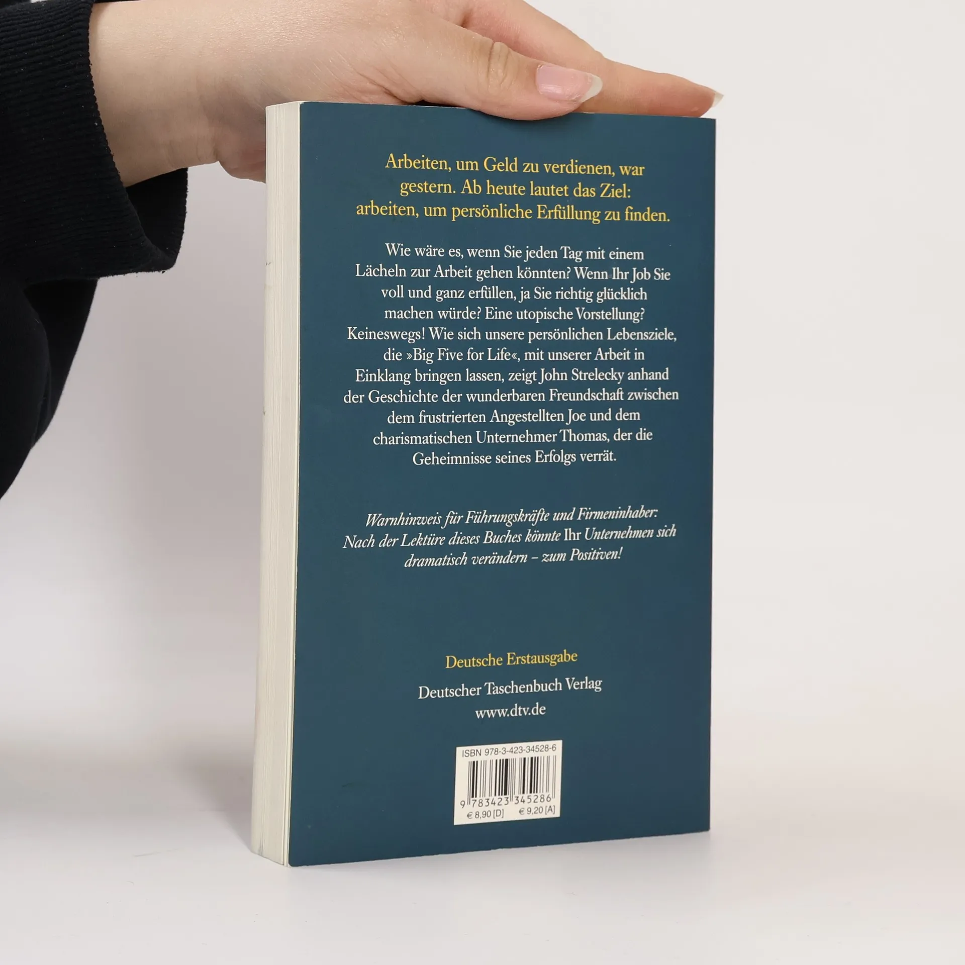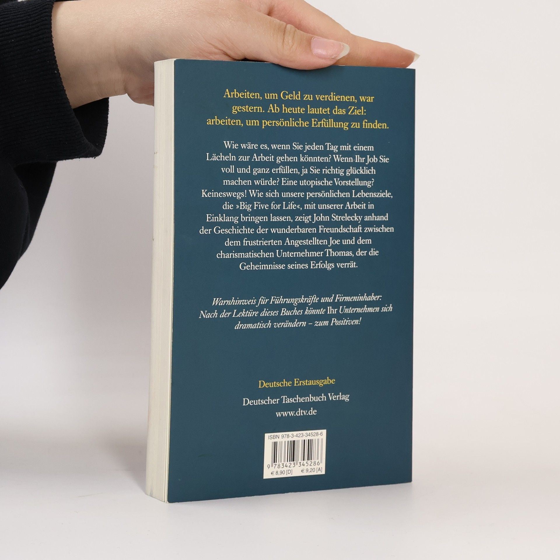 Arbeiten, um Geld zu verdienen, war gestern Durch Zufall lernt Joe, ein mit seinem Job unzufriedener Angestellter, den charismatischen Geschäftsmann Thomas kennen. Rasch entwickelt sich eine tiefe Freundschaft zwischen den beiden Männern. Thomas wird zu Joes Mentor und offenbart ihm die Geheimnisse seines Erfolgs. Er zeigt Joe, wie wichtig es ist, auch in der Arbeit erfüllt zu sein. Seine Unternehmen führt Thomas anhand zweier Leitlinien: Jeder Mitarbeiter muss seine Bestimmung sowie seine »Big Five for Life« kennen, also wissen, welche fünf Ziele er im Leben erreichen will. Diese Ideen helfen Joe, seine Wünsche zu verwirklichen. Doch Thomas will möglichst viele an seinem Wissen teilhaben lassen: Seine gesammelten Aufzeichnungen liegen hier vor Ihnen. Arbeiten, um Geld zu verdienen, war gestern. Ab heute lautet das Ziel: arbeiten, um persönliche Erfüllung zu finden.