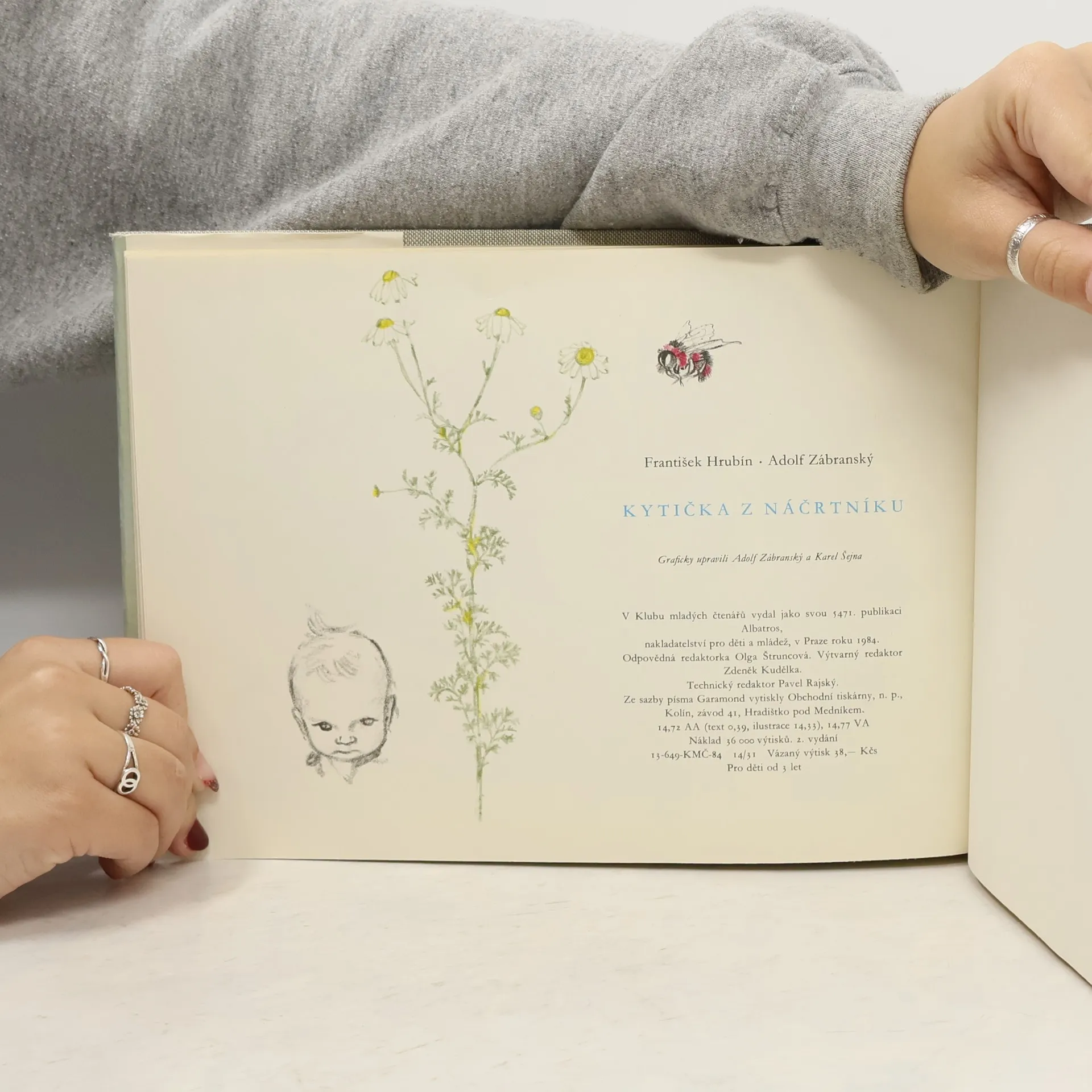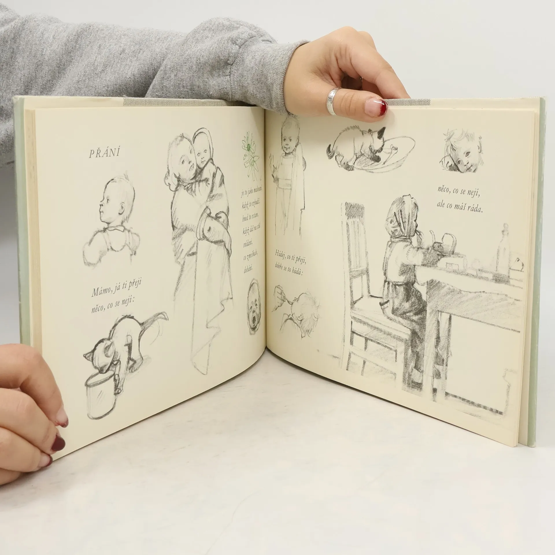 Kouzelné obrázky miminek, batolat s maminkami, zvířátek, motýlů atd. Uhlem, tužkou, jemně podkreslené barvami, jako z náčrtníku. To vše doplněné verši Františka Hrubína. Jedna z nejkrásnějších knížek o dětech a nejen pro děti.