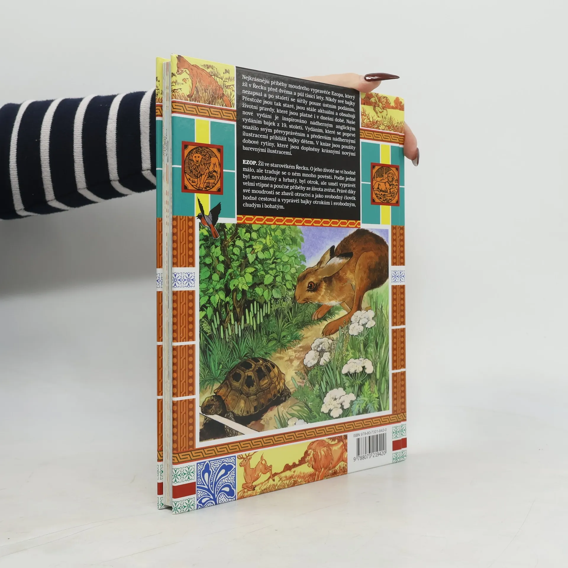 Nejkrásnější příběhy moudrého vypravěče Ezopa, který žil v Řecku před dvěma a půl tisíci lety. Nikdy své bajky nezapsal a po staletí se šířily pouze ústním podáním. Přestože jsou tak staré, jsou stále aktuální a obsahují životní pravdy, které jsou platné i v dnešní době. Toto nové vydání je inspirováno nádherným anglickým vydáním bajek z 19. století. Vydáním, které se poprvé snažilo svým převyprávěním a především nádhernými ilustracemi přiblížit bajky dětem. V knize jsou použity dobové rytiny, které jsou doplněny krásnými novými barevnými ilustracemi.