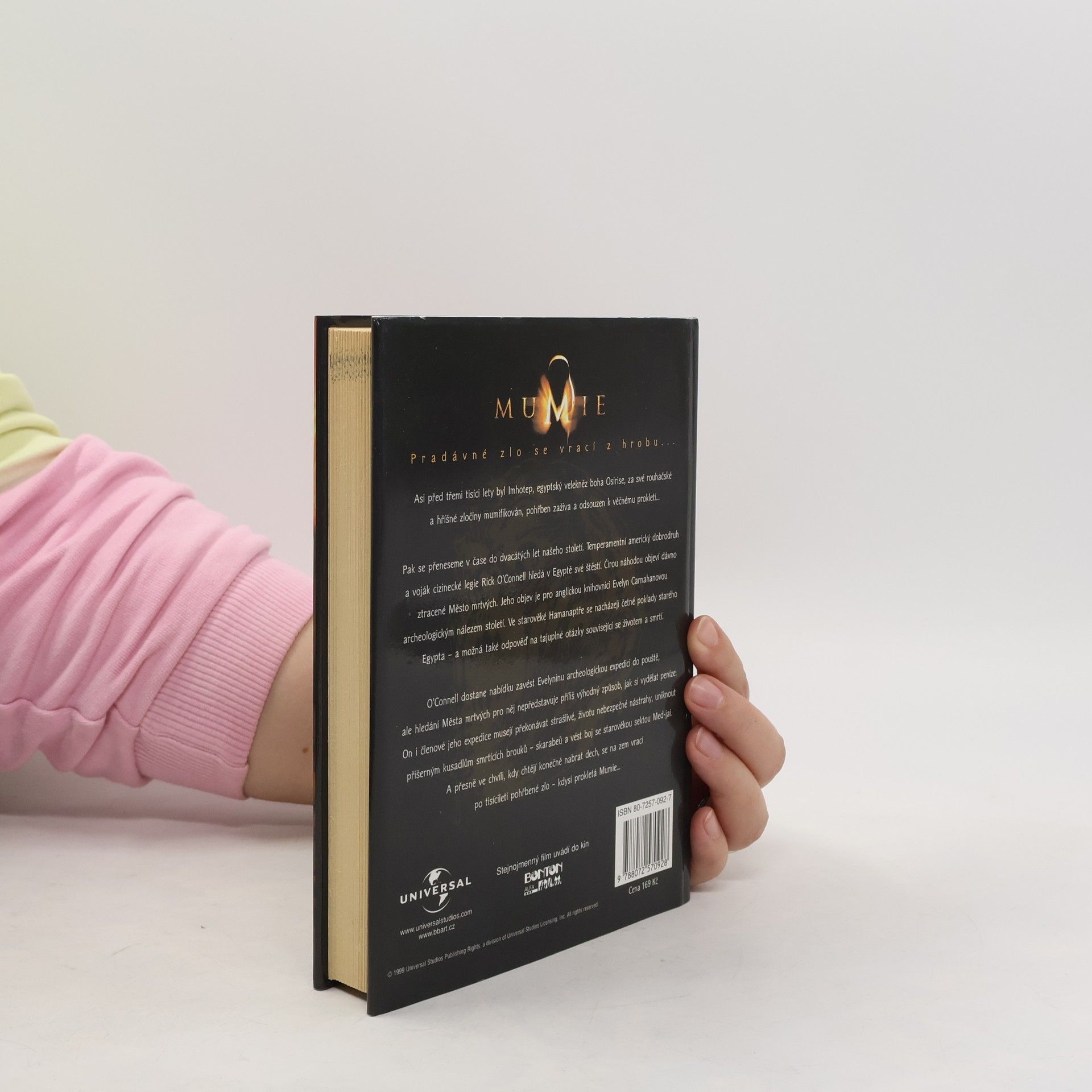 Podle filmového scénáře Stephena Sommerse. Pradávné zlo se vrací z hrobu… Asi před třemi tisíci lety byl Imhotep, egyptský velekněz boha Osirise, za své rouhačské a hříšné zločiny mumifikován, pohřben zaživa a odsouzen k věčnému prokletí… Pak se přeneseme v čase do dvacátých let našeho století. Temperamentní americký dobrodruh a voják cizinecké legie Rick O´Connell hledá v Egyptě své štěstí. Čirou náhodou objeví dávno ztracené Město mrtvých. Jeho objev je pro anglickou knihovnici Evelyn Carnahanovou archeologický nález století. Ve starověké Hamanaptře se nacházejí četné poklady starého Egypta – a možná také odpověď na tajuplné otázky související se životem a smrtí. O´Connell dostane nabídku zavést Evelininu archeologickou expedici do pouště, ale hledání Města mrtvých pro něj nepředstavuje příliš výhodný způsob, jak si vydělat peníze. On i členové jeho expedice musejí překonávat strašlivé, životu nebezpečné nástrahy, uniknout příšerným kusadlům smrtících brouků – skarabeů a vést boj se starověkou sektou med-jai. A přesně ve chvíli, kdy chtějí konečně nabrat dech, se na zem vrací po tisíciletí pohřbené zlo – kdysi prokletá Mumie…